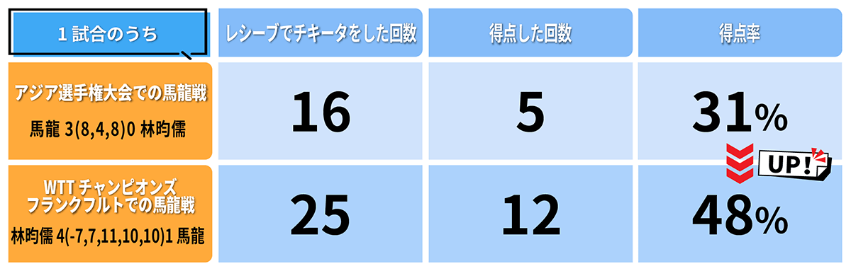 アジア選手権の準決勝で馬龍と対戦したときの林昀儒のチキータからの得点率が31.25パーセントだったのに対し(16回チキータして5回得点)、WTTフランクフルトの決勝で馬龍と対戦した際は、得点率が48パーセントに伸びた(25回チキータして12回得点)。アジア選手権は5ゲームスマッチ、WTTフランクフルトは7ゲームスマッチとゲーム数の違いはあるが、各ゲームにおける林昀儒がチキータを使う割合はほぼ変わらない。それにもかかわらず、ストレート負けを喫したアジア選手権の時より、WTTフランクフルトの方がチキータからの得点率が16.75パーセントも上昇している。