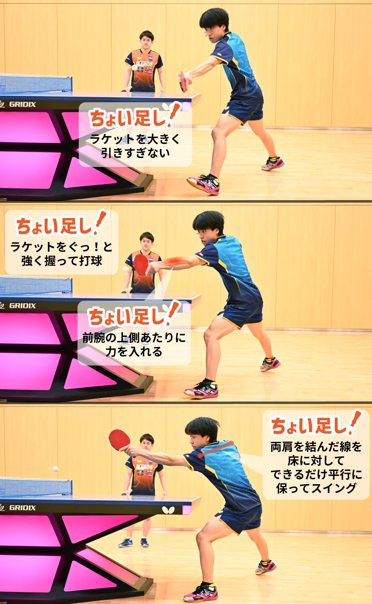 チキータとは異なり、直線的な軌道を描くフリック。台上から主導権を握るためにとても有効な技術です。安定したフリックを身に付けたいという選手は、ぜひ及川選手が教えてくれたちょい足しポイントを実践してみましょう。