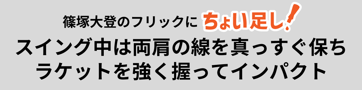 篠塚のフリックはバックスイングがちょっと大きいので、そこまで大きくラケットを引かないで、ボールにできるだけラケットを近づけるようにバックスイングを取り、打つ瞬間にラケットをぐっ!と握るイメージでパーンと打つといいと思います。(篠塚のフリックは)少し力が抜けてしまっている感じです。