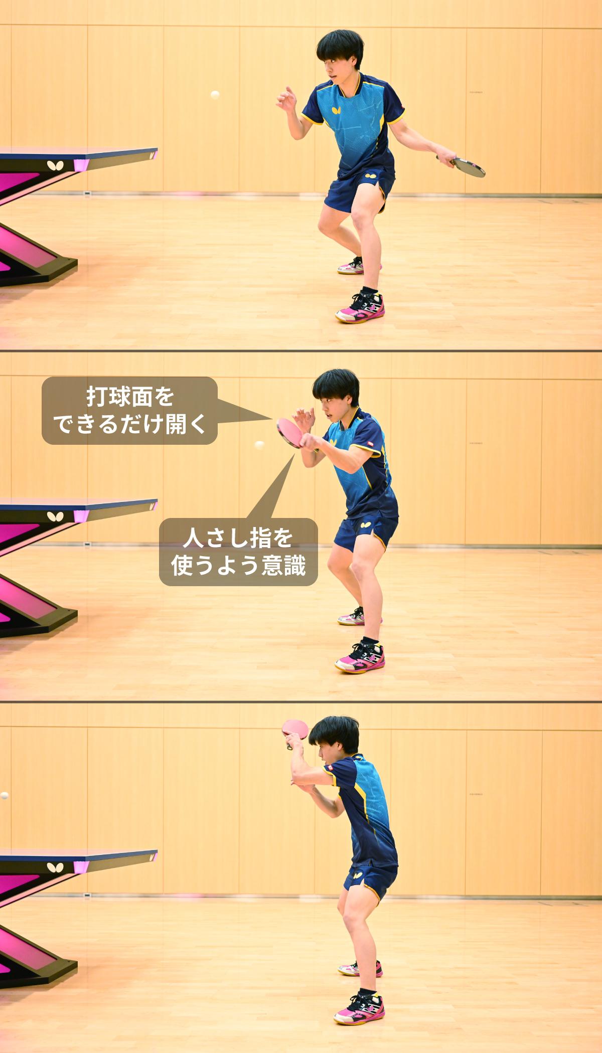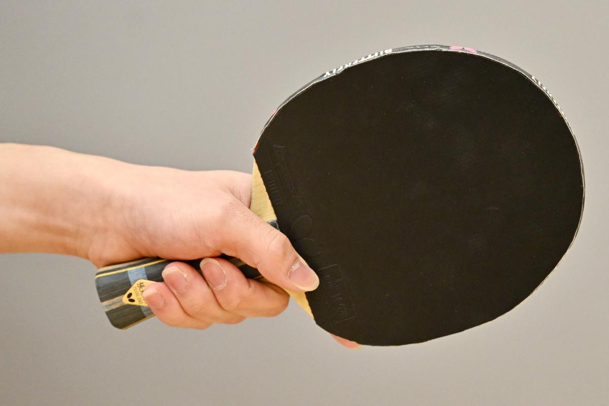 バックハンドを打つときのグリップのままだと、どうしてもフォアハンドは巻き気味になりやすいので、フォアハンドを打つときは打球面を開くようなグリップに変えるよう意識しています。