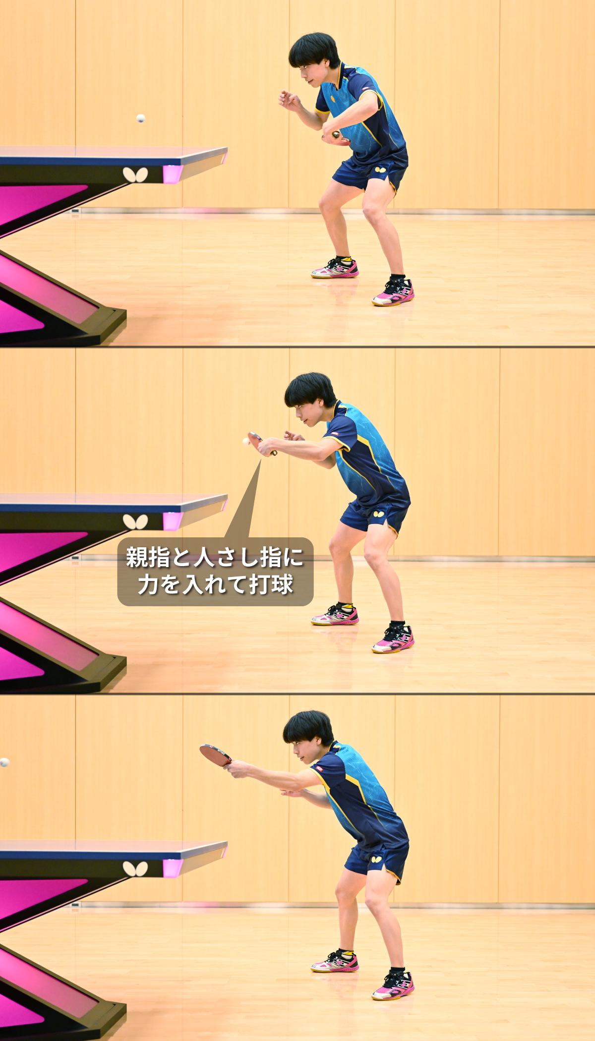 篠塚 バックハンドは、親指と人さし指に力を入れるようにしています。バックハンドで中指・薬指・小指に力を入れる人はあまりいないのではないでしょうか。でも、フォアハンドとバックハンドとでグリップをあまり変えない選手は、もしかしたらバックハンドを打つときに中指・薬指・小指に力を入れているかもしれないですね。