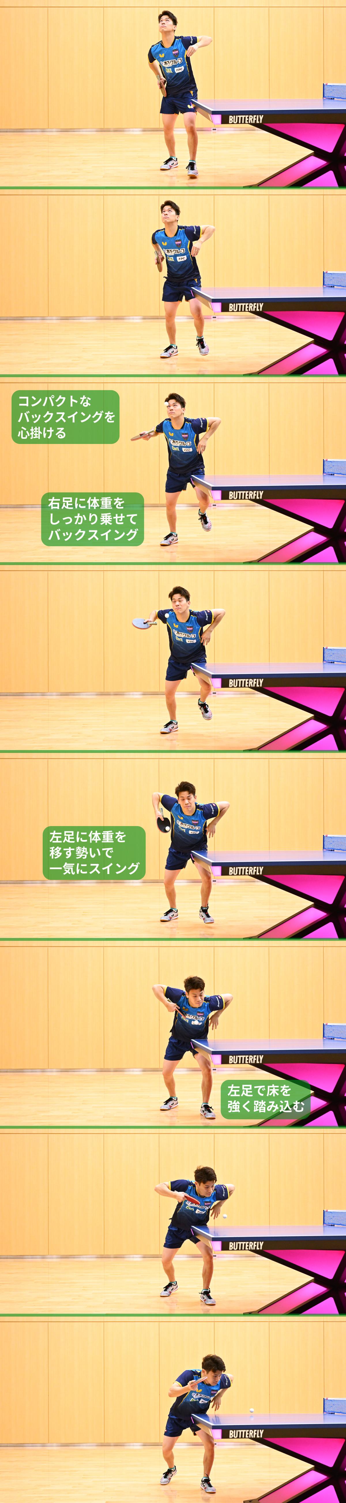 加えて、練習する際は、前述したように「体重移動」に加え、「踏み込み」を意識してください。具体的には、右利きの選手がフォアハンドでサービスを出す場合、右足から左足への重心移動と、左足を強めに踏み込むよう意識してサービスを出しましょう。卓球の技術において体重移動と踏み込みは、スイングを速くするため、威力を増すためにとても重要なポイントです。フォアハンド、バックハンドとも体重移動をしっかり使って踏み込んで打球することでボールの質が高まりますが、サービスも同様です。サービスに思うように勢いが出ないという選手は、ぜひ体重移動と踏み込みを意識して練習に取り組んでください。