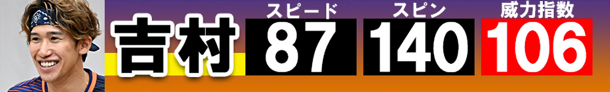 築地 吉村選手の記録が出ました。速度が87キロ、回転数が140回転、威力指数が106です。