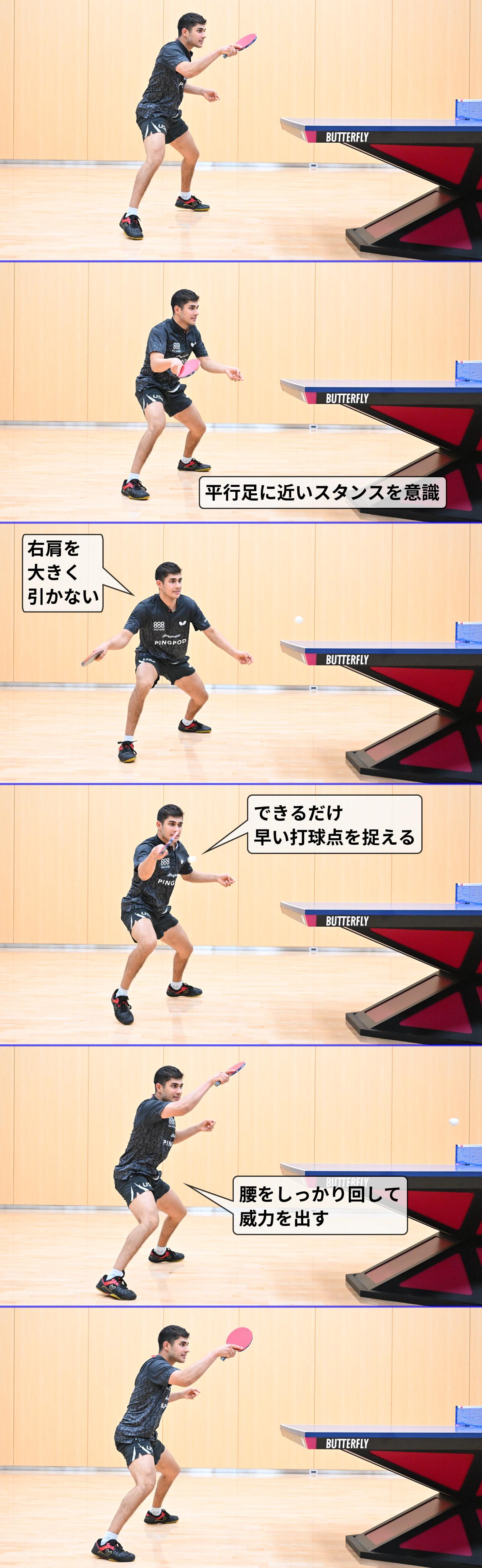 具体的には、フォアハンドを打つときに「平行足に近いスタンス」で打つことです。そうすると、その分だけ早いタイミングでボールを捉えることができます。一方、左足が大きく前のスタンスでフォアハンドを打とうとすると打球点が遅くなってしまい、速攻はできません。