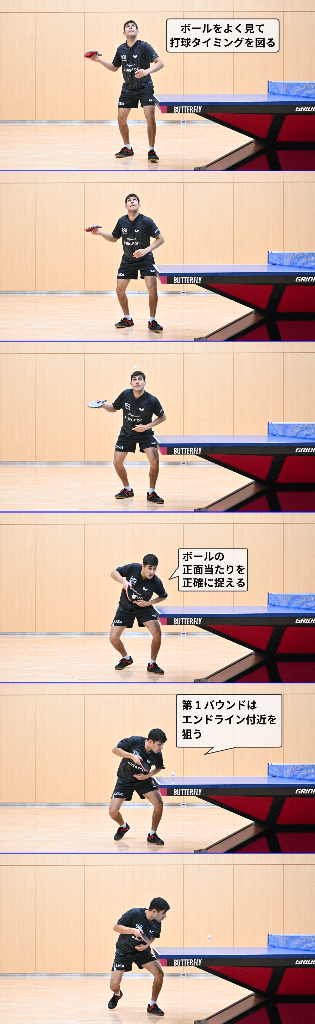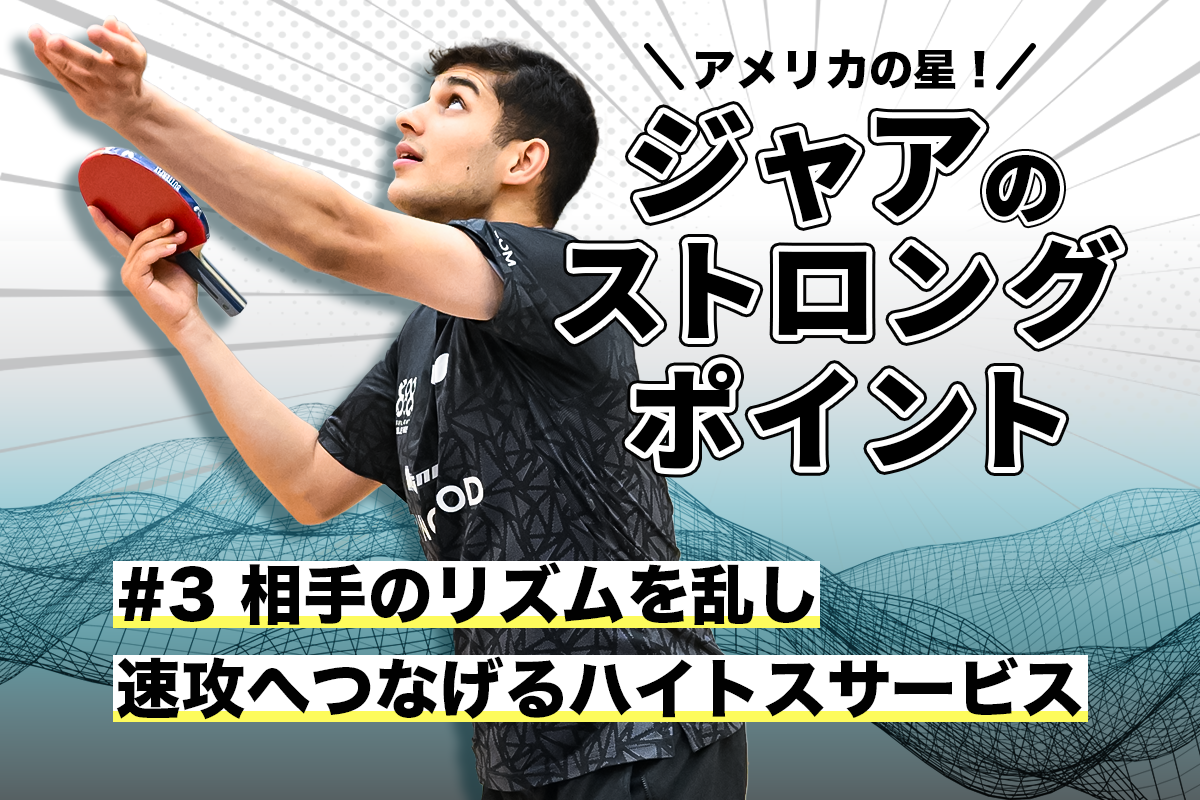 ジャア 自分のサービスは、ハイトスサービス(投げ上げサービス)を多く使うのが特徴です。ハイトスサービスは、ジュニア時代にコーチだったステファン・フェス(元アメリカ代表監督)に教えてもらったり、ステファンの義理の父が元中国代表の李振恃(1977、1981年世界卓球男子ダブルス優勝)で、李振恃から直接指導を受けたり、彼のまねをしたりして覚えました。
