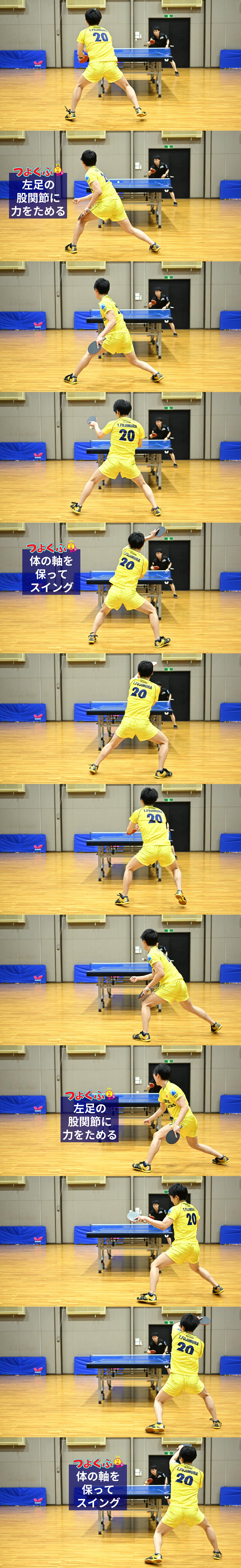 これらを意識しながら、手打ちにならないよう体全体を使ってスイングしますが、全力ではなく、7割から8割程度の力で打球することも、僕がフットワーク練習を行う上で心掛けているポイントです。