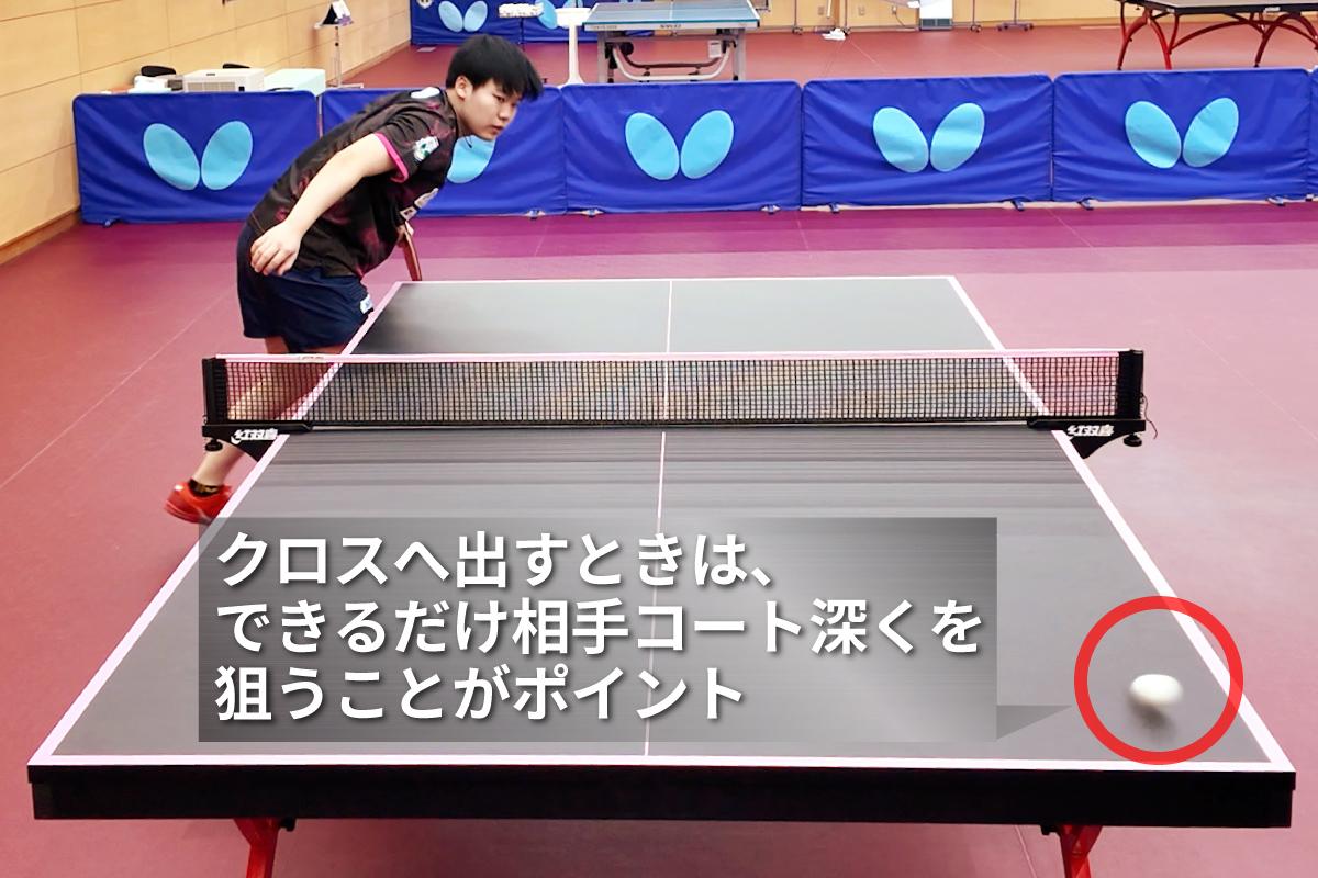 もちろん、相手のフォア側にロングサービスを出すこともありますが、クロスへ出すときは、ストレートへ出すときと比べて少しプレッシャーがかかります。クロスはストレートに比べて距離が長いので、甘くなってしまうと相手に狙い打たれてしまうからです。そのため、ロングサービスをクロスへ出すときは、相手コートのできるだけ深いところを狙うよう心掛けています。