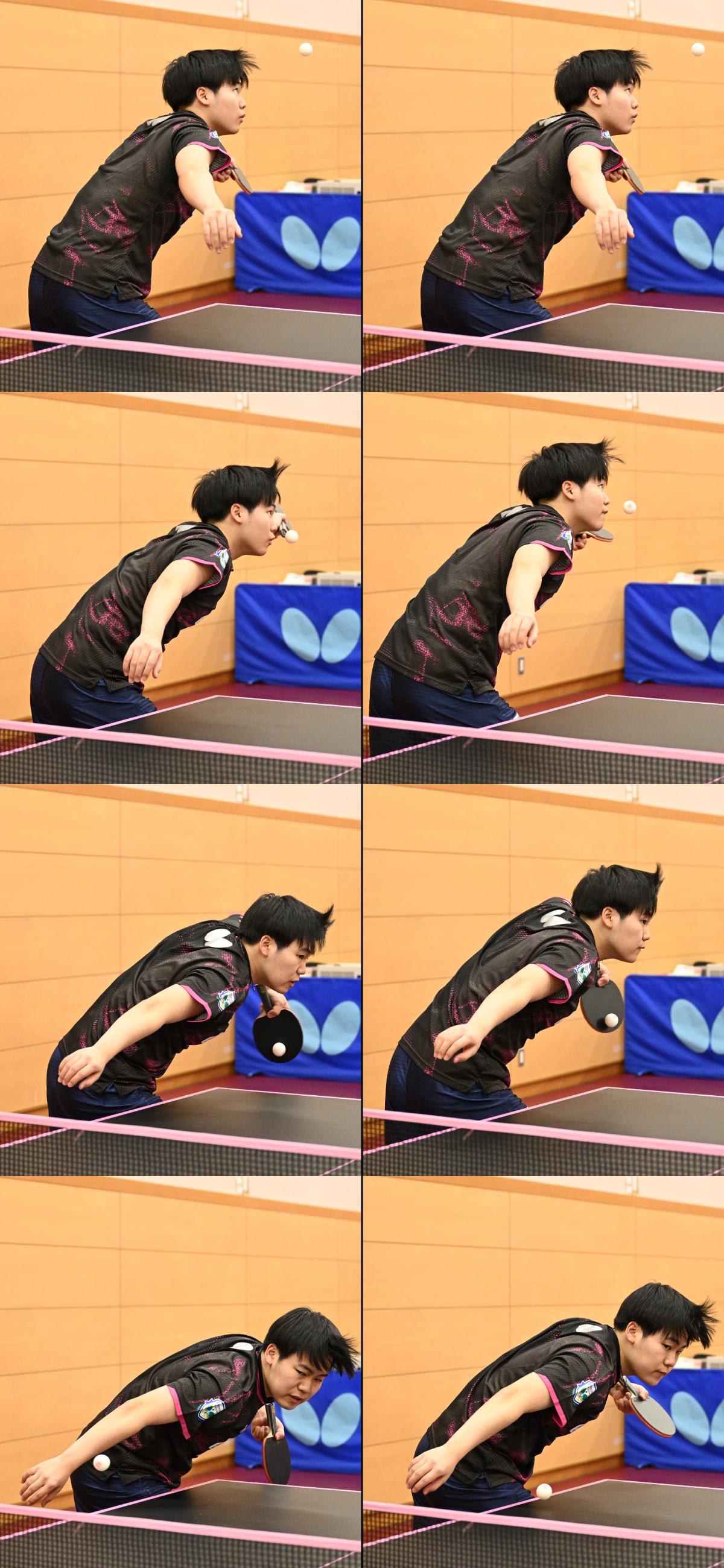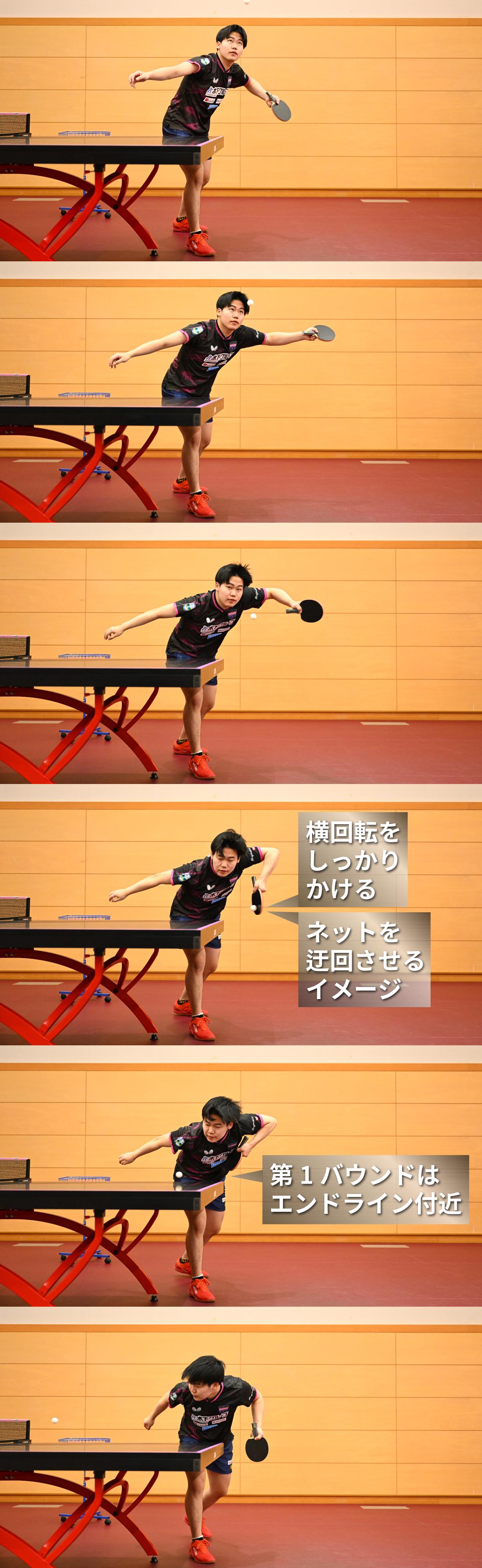 松島が紹介してくれた横回転ロングサービスでは、台の高さに近いところで打球しているところも、ぜひ参考にしてほしい。打球位置が台に近いほど、ボールの軌道が低くなるので、ロングサービスの威力が高まりやすくなる。正確に打球できるよう、ボールが落下してくるところをしっかり注視しているところも見習いたいポイントだ。