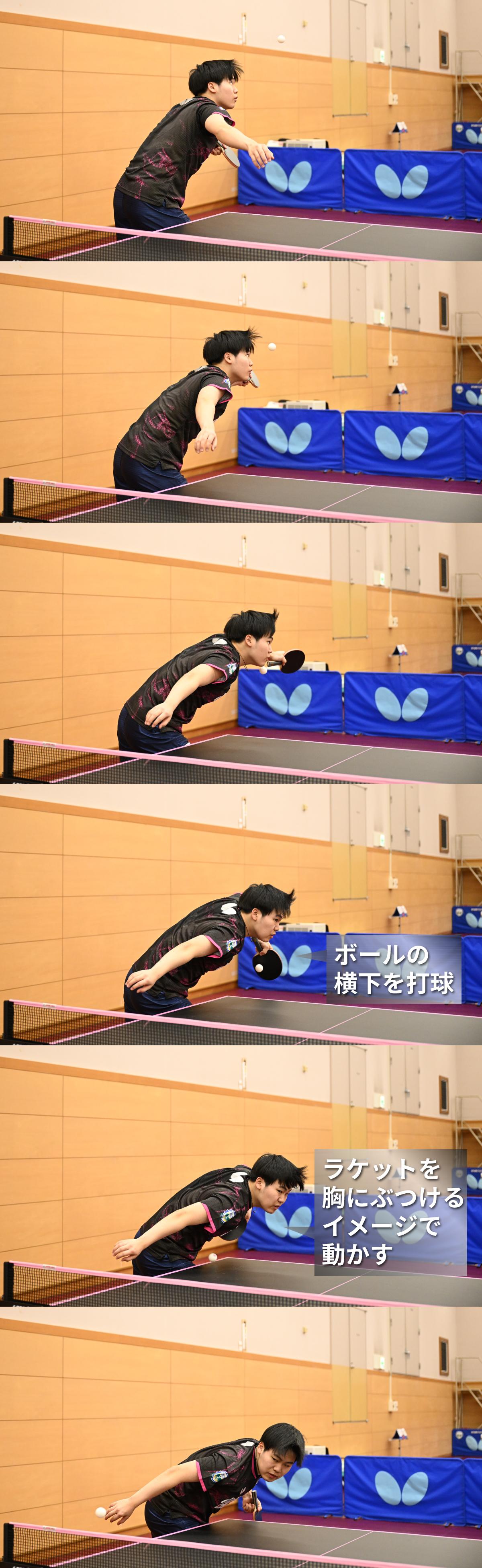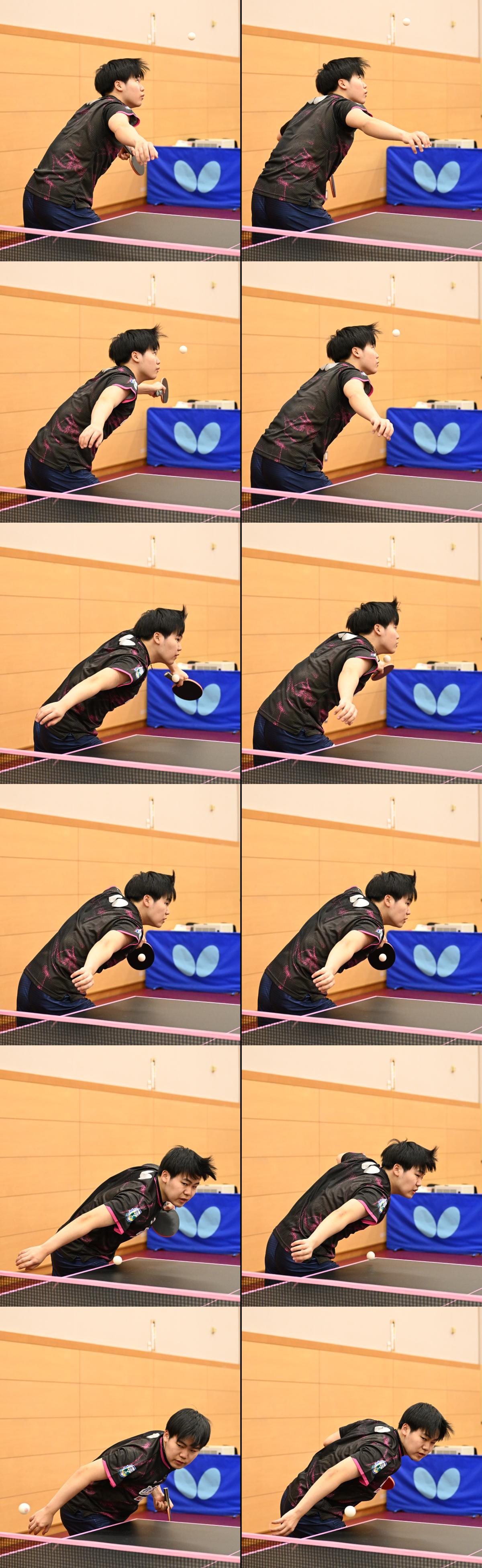 前回紹介してくれた横回転ロングサービスと、今回紹介してくれた横上回転ロングサービス、横下回転ロングサービスを自在に出し分けるのが、松島の強さを支える大きな土台だ。松島のように、1種類だけでなく、ロングサービスのバリエーションを持つことで相手に大きなプレッシャーをかけることができ、戦い方の幅も広がる。松島が話してくれたポイントと連続写真の動作を参考にして、ぜひロングサービスのバリエーションを増やし、その一つ一つを磨いてほしい。