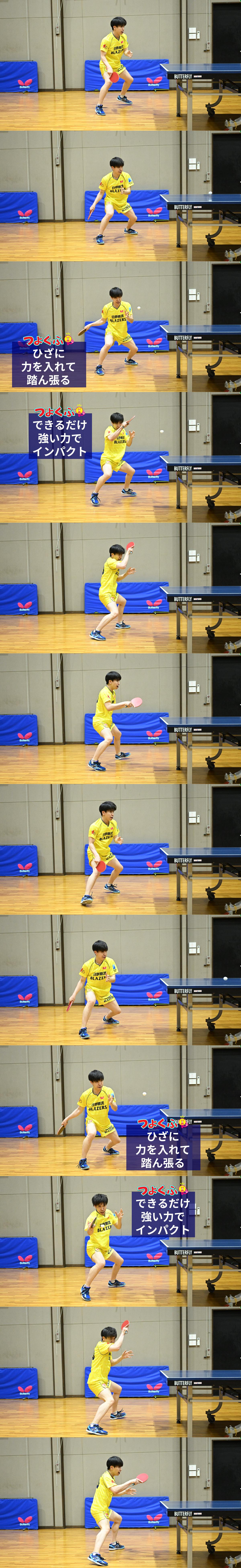 フォアハンドドライブを強く打つためには強いインパクトが必要であり、そのためには、腕だけではなく、下半身を使うことが大切です。具体的には、ひざに力を入れて踏ん張ることを意識して、インパクトを強くしています。