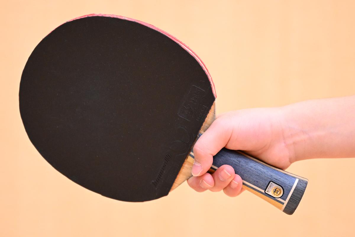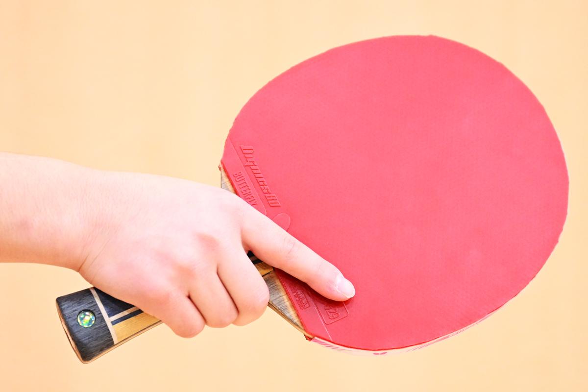 シェークハンドラケットのグリップは、その名前の通り、人と握手をするように握ります。中指・薬指・小指をラケットの柄にかけ、親指と人さし指でラケットの板(ブレード)を挟むように握ります。どの指にも力を入れすぎず、指全体をリラックスさせたグリップを心掛けてください。