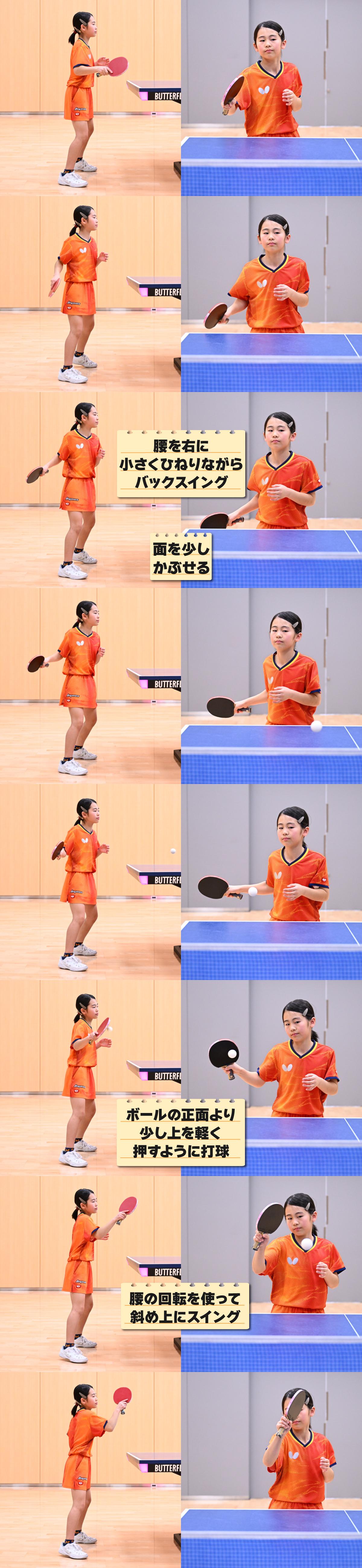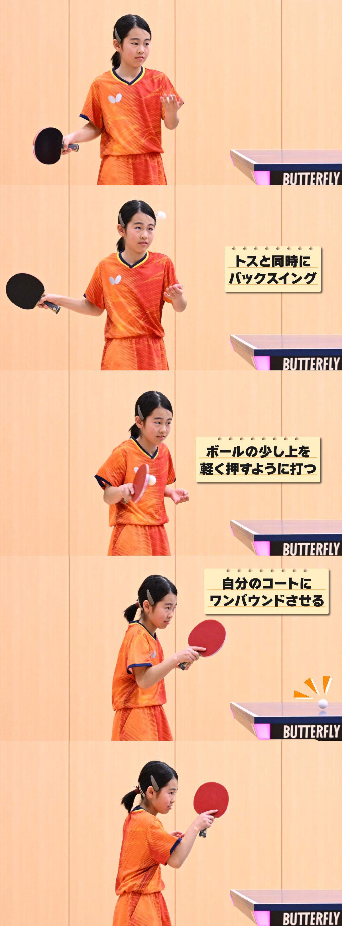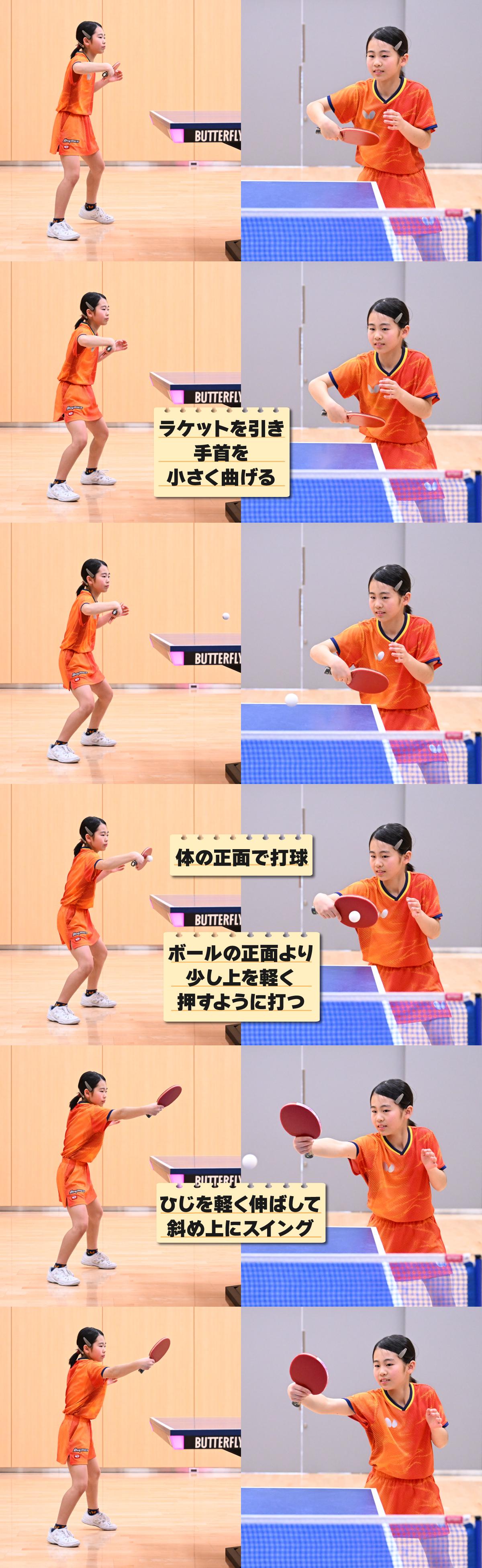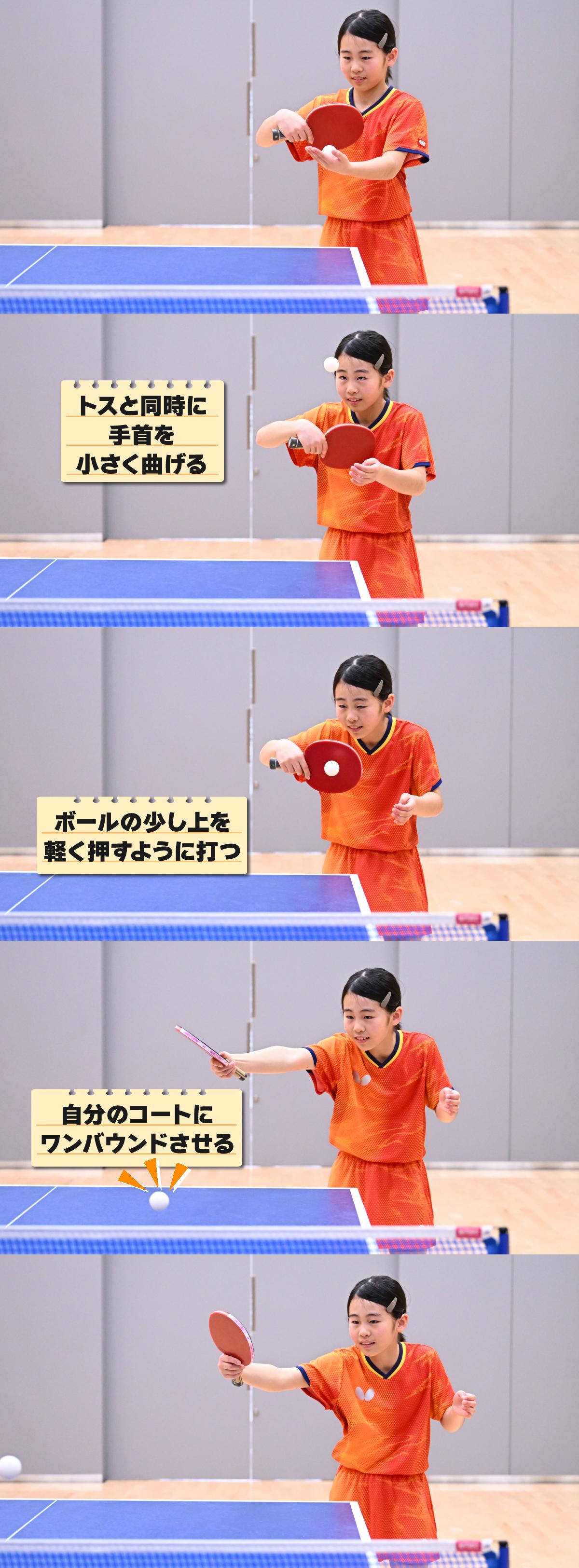 自分から相手にボールを出すことは、ラリーをするためはもちろんのこと、卓球で大切な「サービス」にもつながる動作です。説明したポイントや上の連続写真を参考にして、ぜひリズムよくボールを出せるようになりましょう。