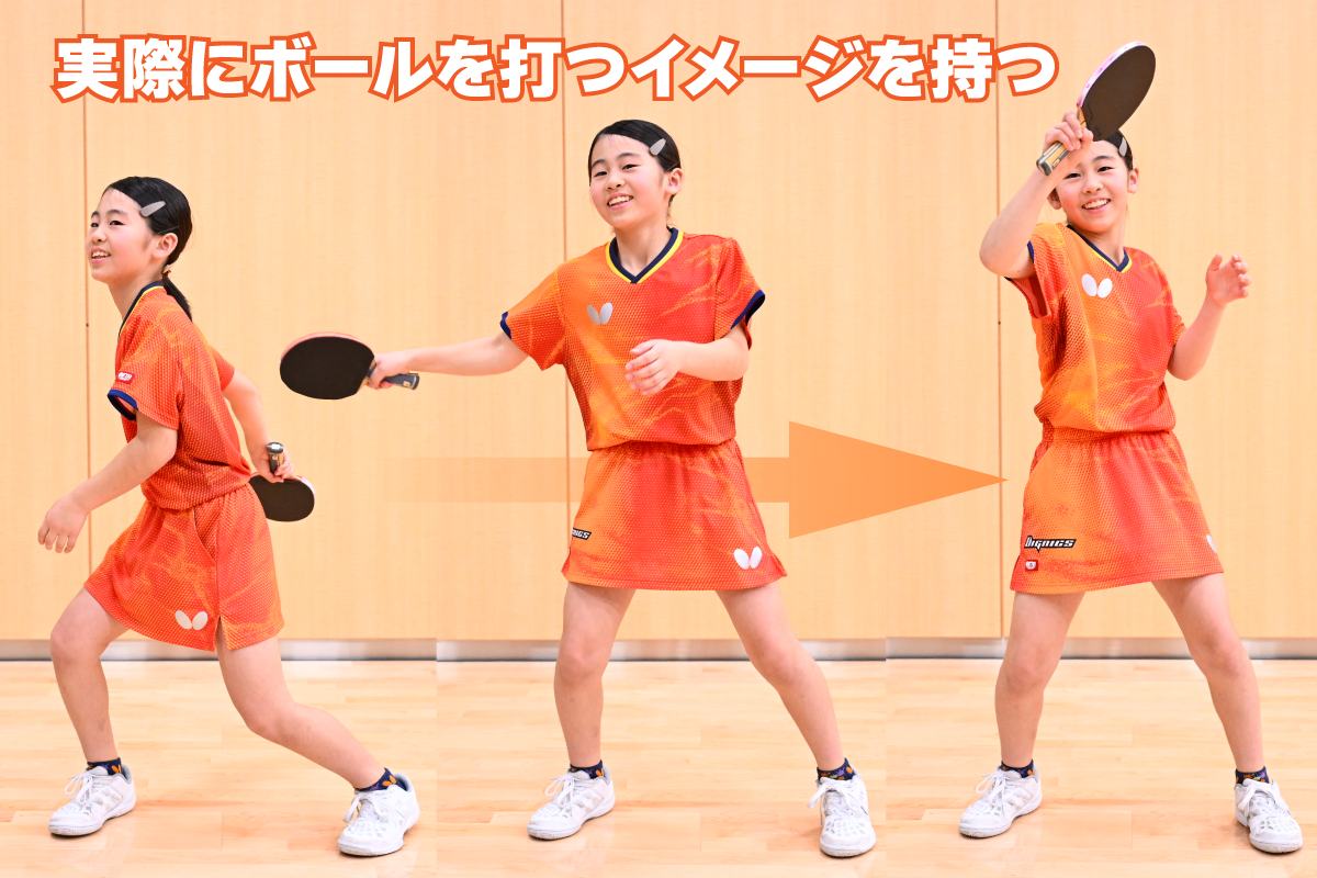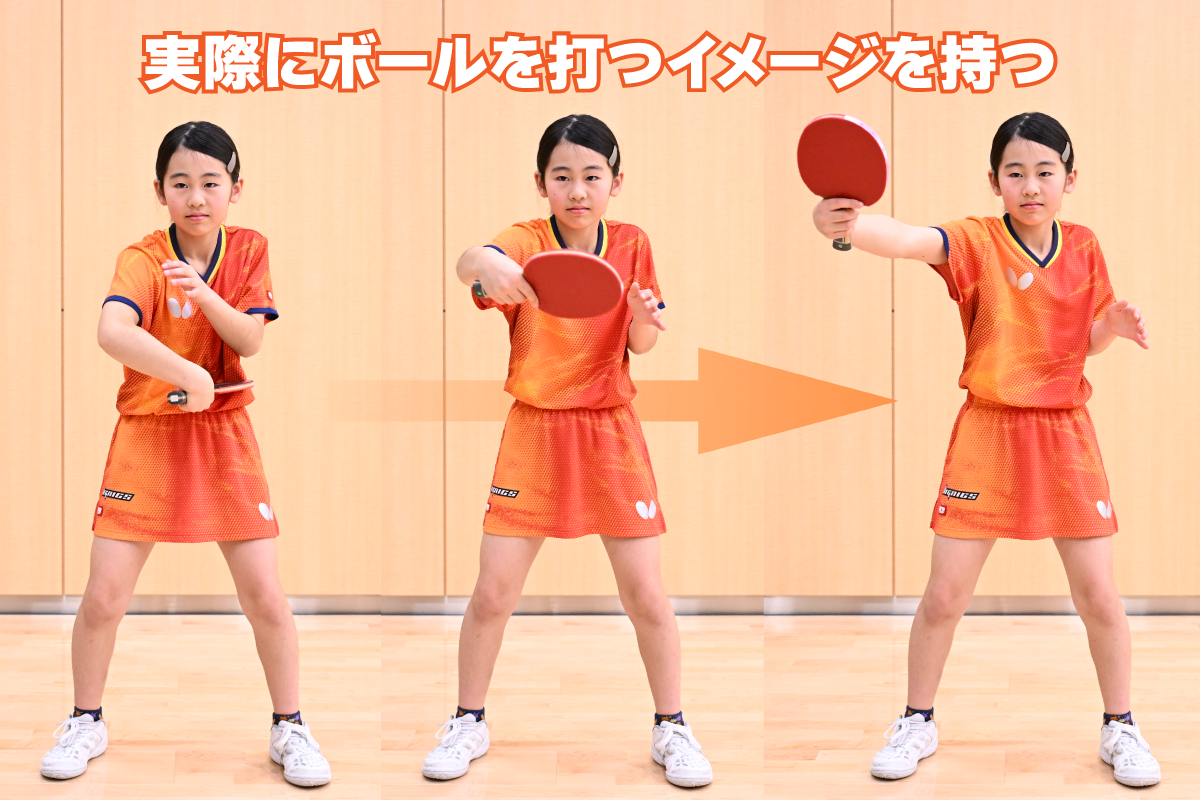 これまで紹介してきた打法を身に付けるために、ぜひ行ってほしいのが、ボールを使わずにスイングする「素振り」です。素振りはフォームの確認や改善にとても有効な方法です。ラケットを振るスペースさえあればどこでも行うことができ、練習相手も必要ありません。打球練習に加え、ぜひ素振りを取り入れて、基本打法のスイングをより確かなものにしましょう。