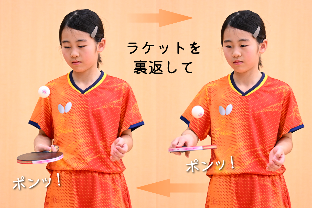 これまで紹介してきた打法のフォームを意識しながら、床に向かって力いっぱい打ったり弱い力で打ったり、いろいろな力でボールを打ってみましょう。そうして、力加減やコントロールをつかんでください。