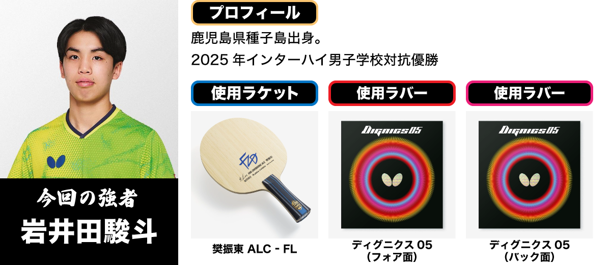 岩井田 ラケットは樊振東 ALCです。以前は、ZLCのラケットを使っていたのですが、安定系のラケットだったので、もう少し飛ばしたいなと思っていろいろ試した結果、今のラケットが飛びすぎずちょうど良い感じだったので使っています。