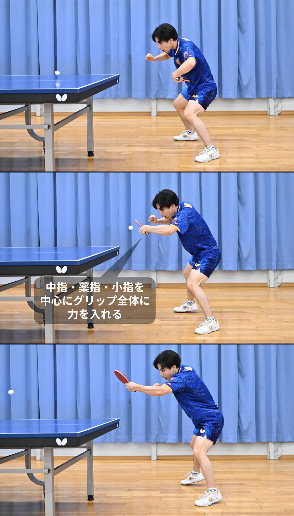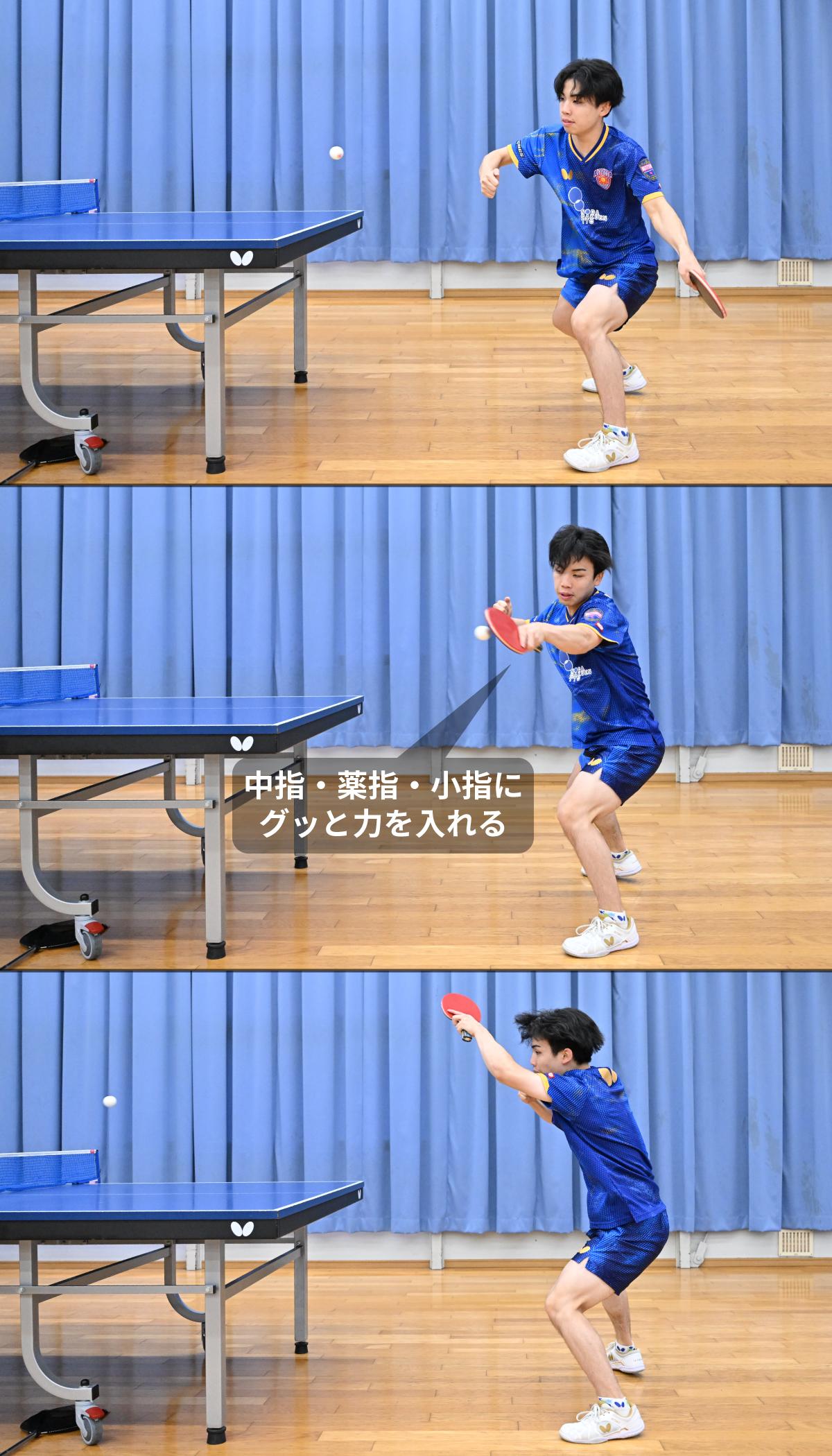 岩井田 中指・薬指・小指です。打つ瞬間に、この3本の指にグッと力を入れて握るイメージでフォアハンドを打ちます。親指は添える程度であまり意識していません。