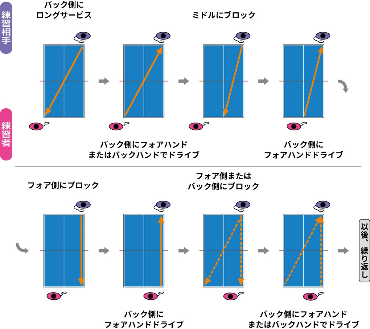 バック側→ミドル(センターライン付近)→フォア側2本(またはフォア側→バック側)の順に送られるボールに対して、基本的にフォアハンドドライブで打球する。