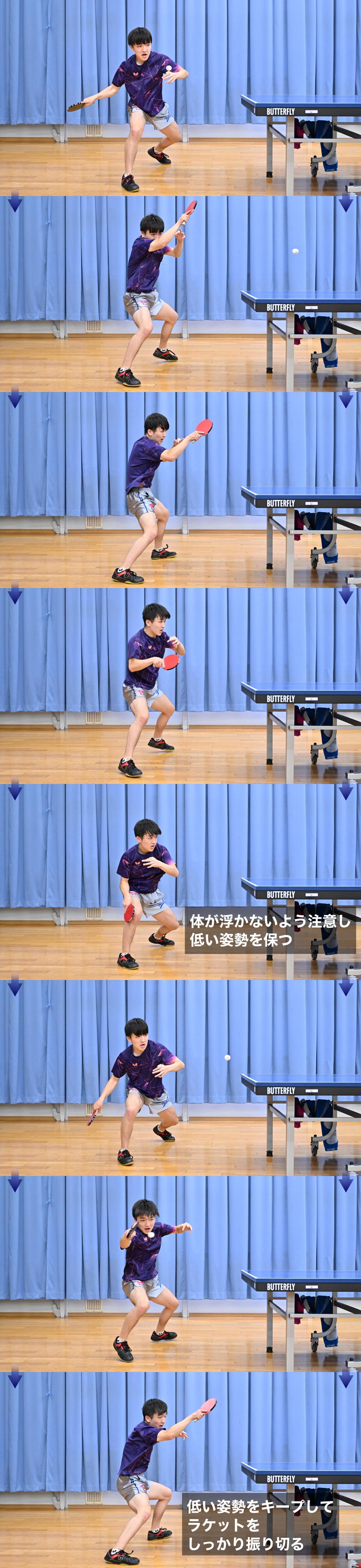 この練習をするときのポイントは、フォア側へ2度突きされたときに、体が浮かないよう低い姿勢を保ってフォアハンドドライブすることです。そうして体のバランスを保つと、ラケットをしっかり振り切ることができますし、次のボールがどこに来ても対応しやすくなります。