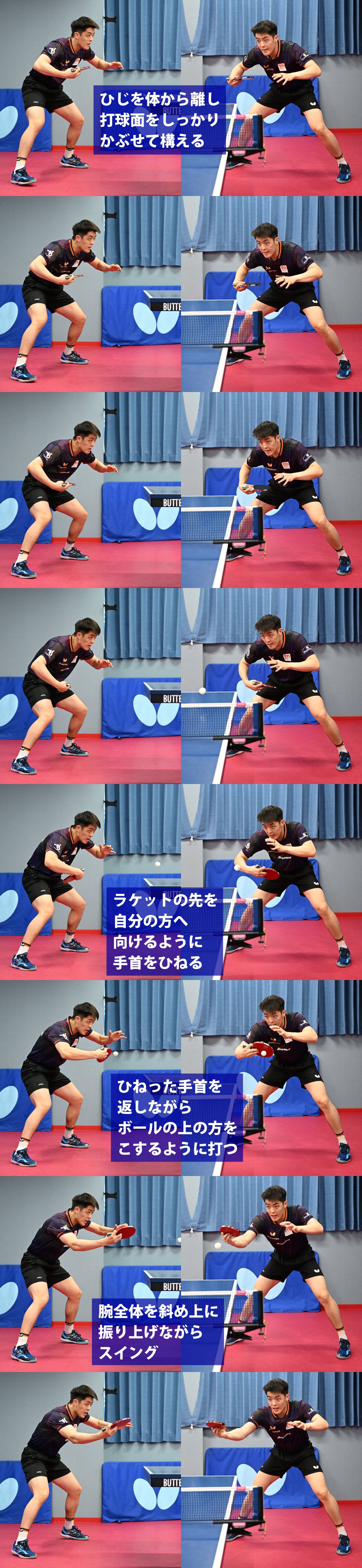 裏面ドライブとは、裏面でボールをこするように打ち、打球に前進回転をかける打法だ。裏面ドライブは、裏面にラバーを貼るペンドライブ型にとって主戦になる技術なので、下に紹介しているダン・チウの連続写真を参考にして、ぜひマスターしよう。