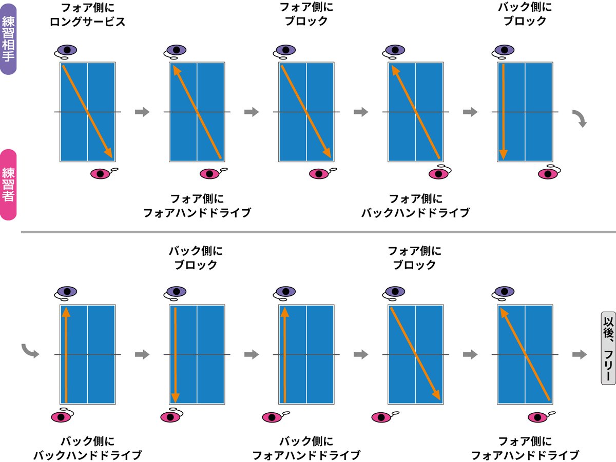 フォア側でフォアハンド→バックハンドの順に打球し、バック側でバックハンド→フォアハンドの順に打球する。練習相手が12本目のブロックを全面に送ったらフリーになり、失点した方が練習を行う。
