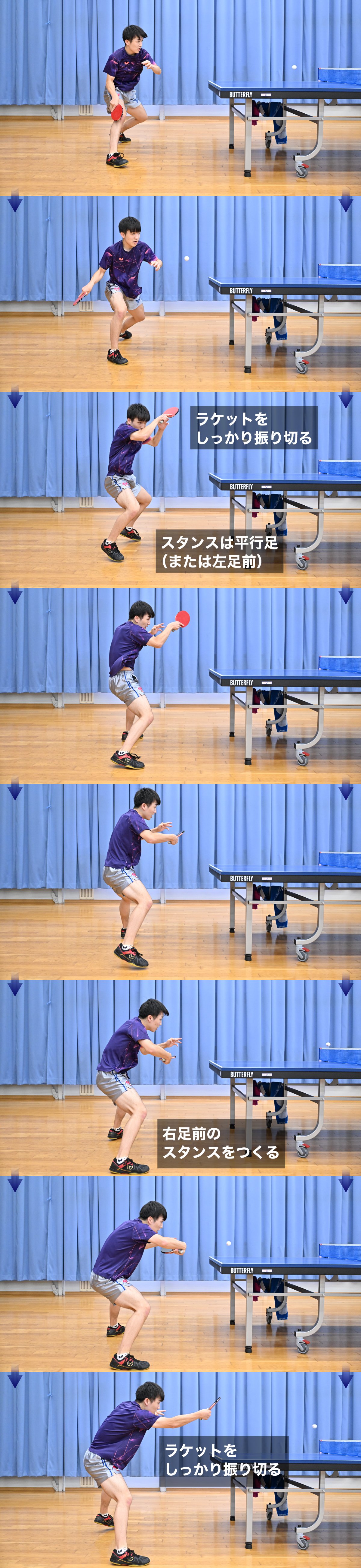 これらのことを踏まえ、今回は、スタンスをスムーズに切り替える足さばきを磨きつつ、フォア側への大きな動きも鍛えるために野田学園で行っている練習メニューを紹介します。