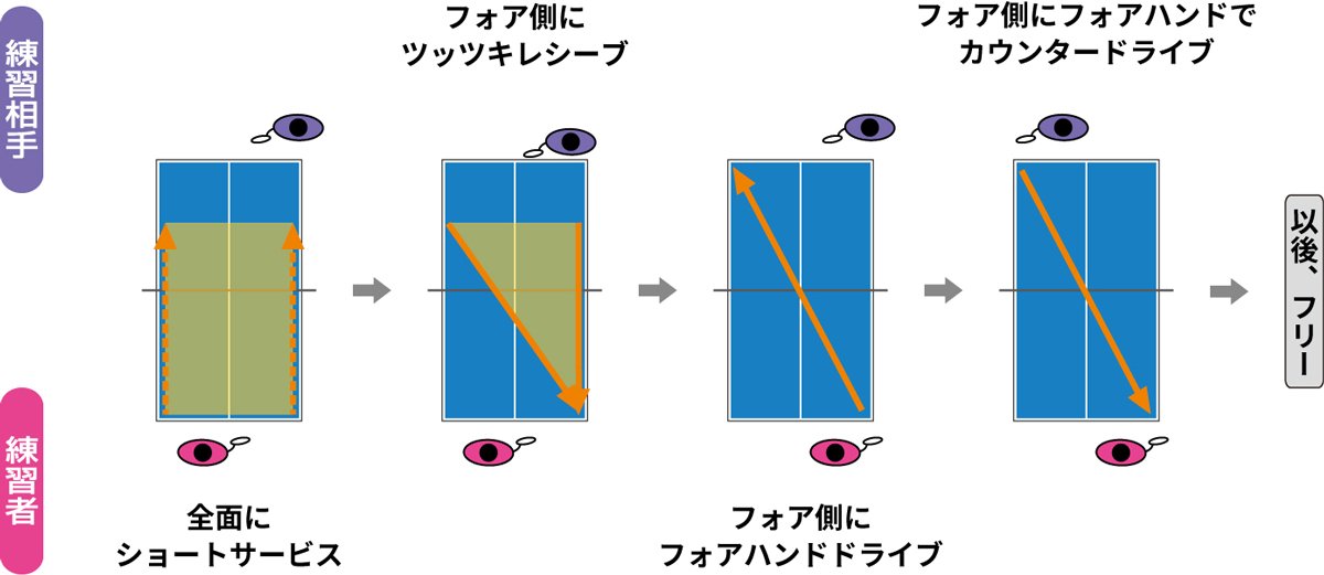 全面にショートサービスを出した後、フォア側に来たツッツキレシーブをフォア側にフォアハンドドライブし、練習相手がフォア側にカウンタードライブしたらフリー。