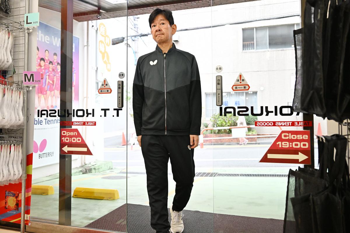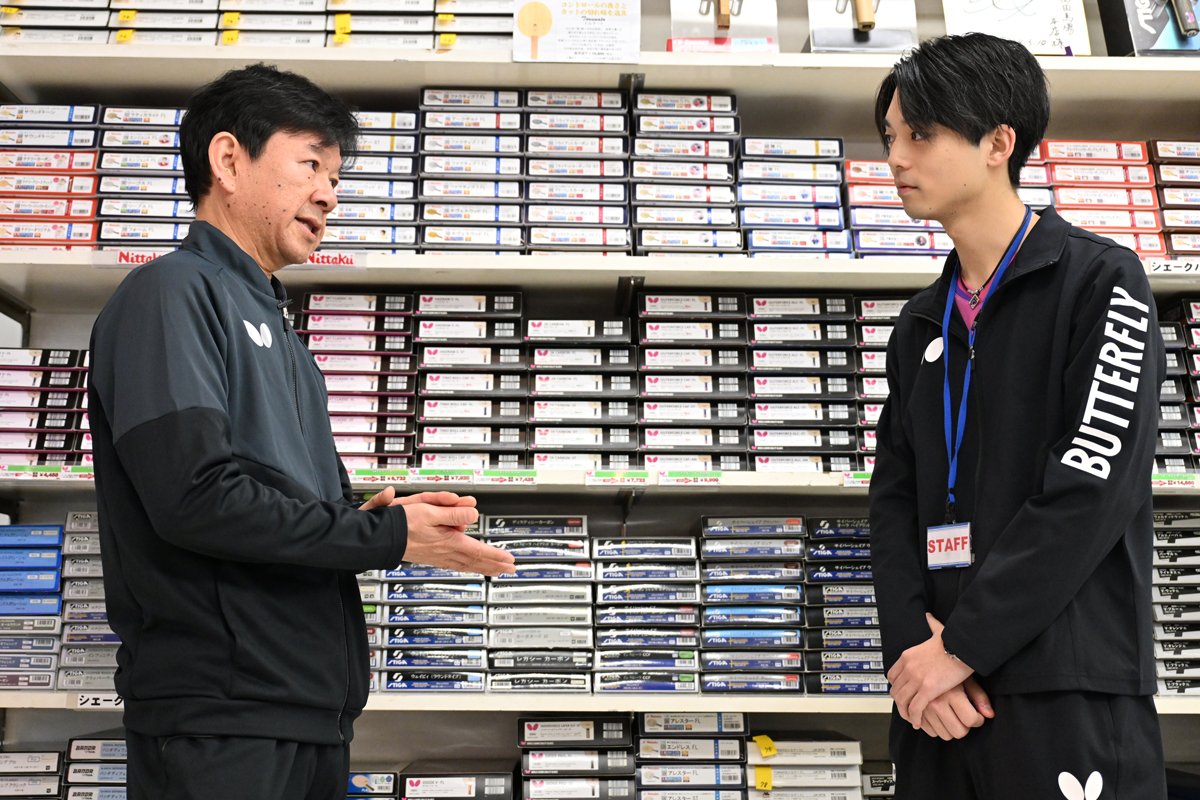 入店前に、父(渋谷五郎)に連れられて、名古屋の卓球ショップを訪れた時の思い出を語ってくれた渋谷浩。久々のショップ訪問に「ワクワクする」と胸を躍らせていた渋谷が豊富な品ぞろえでおなじみの国際卓球さんにお邪魔しました。