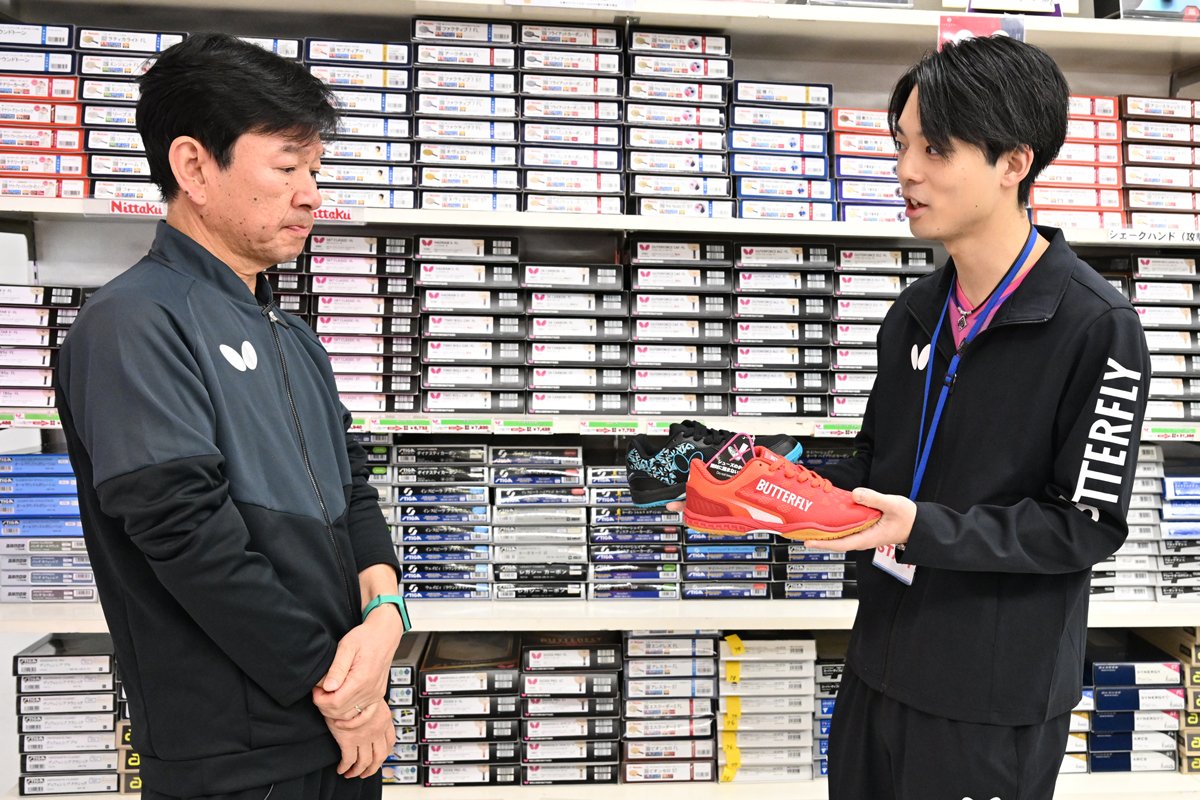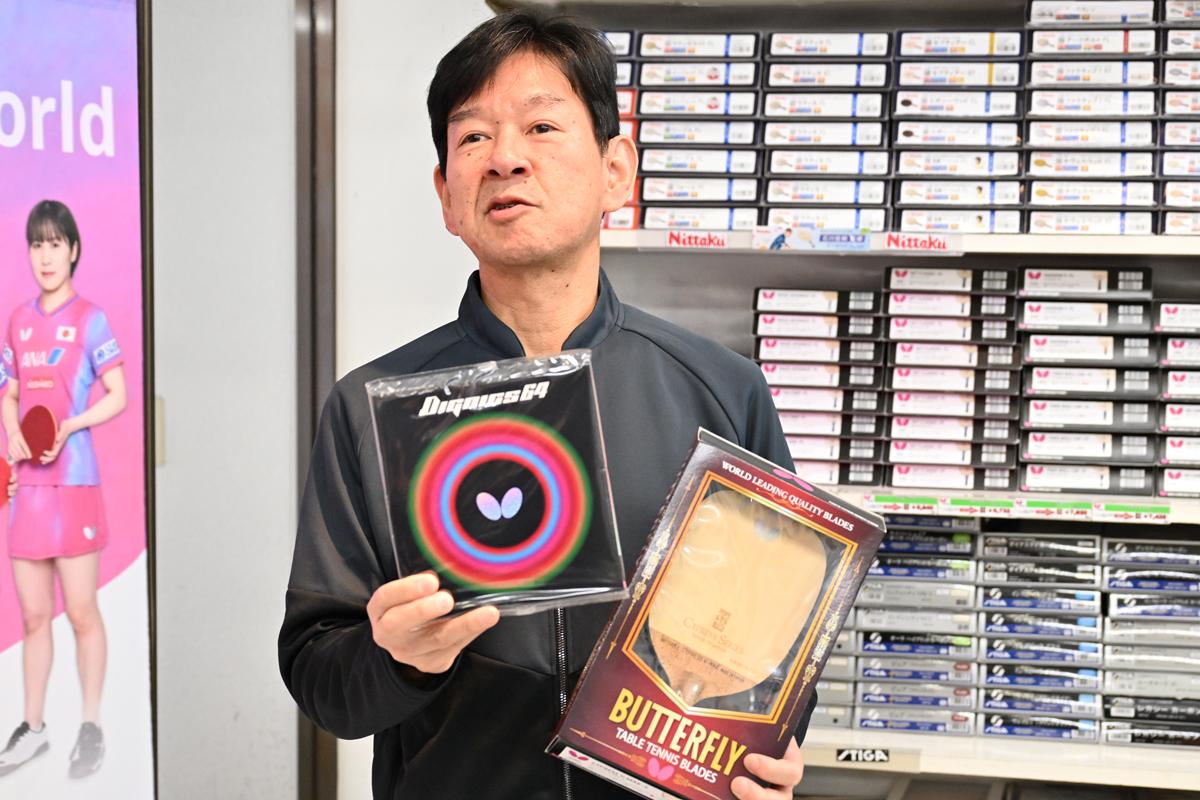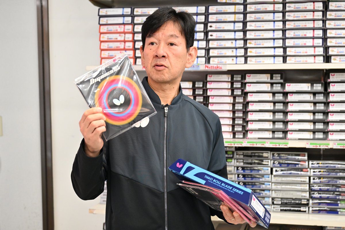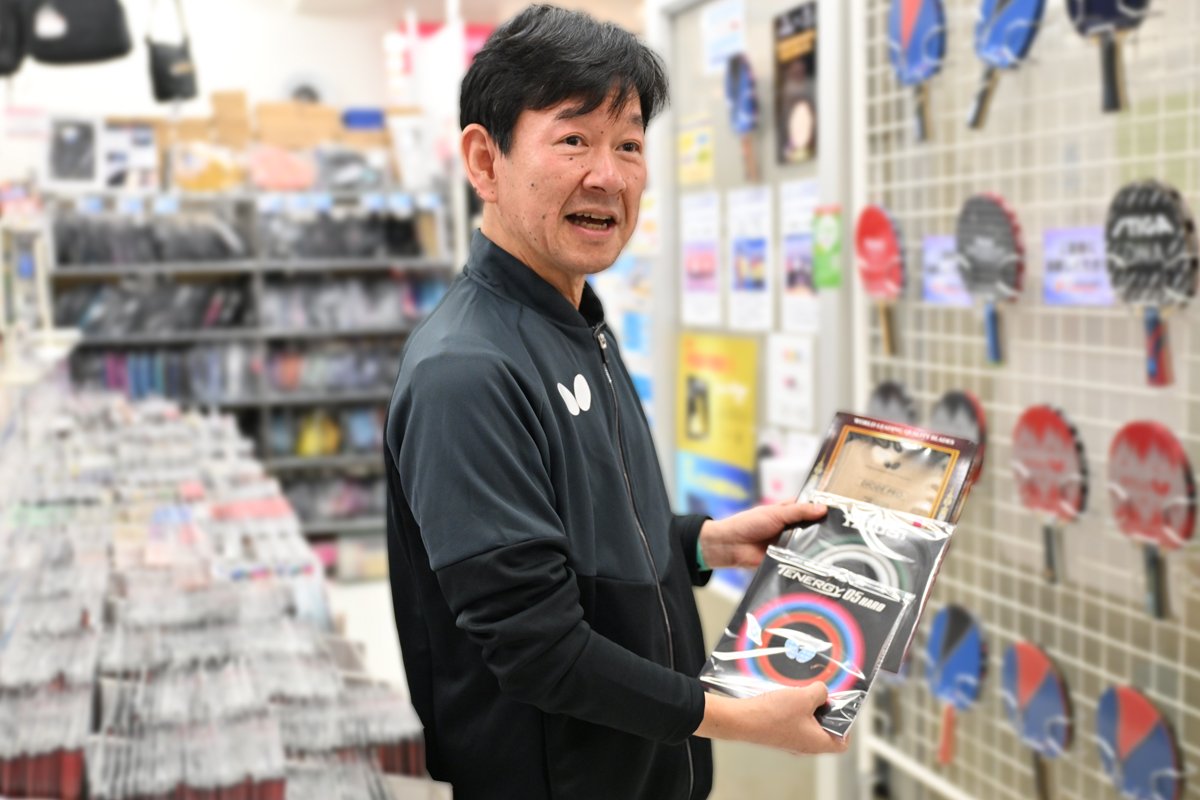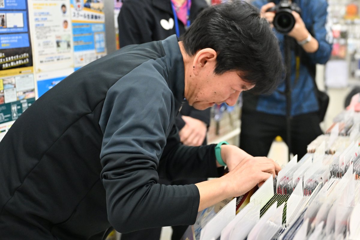 「おかえり卓球」視聴者の皆さんへの用具アドバイスに先駆けて、久々の卓球ショップ訪問に刺激を受けた渋谷がまず「自分が卓球を再開するなら」を想定して、用具を選びました。