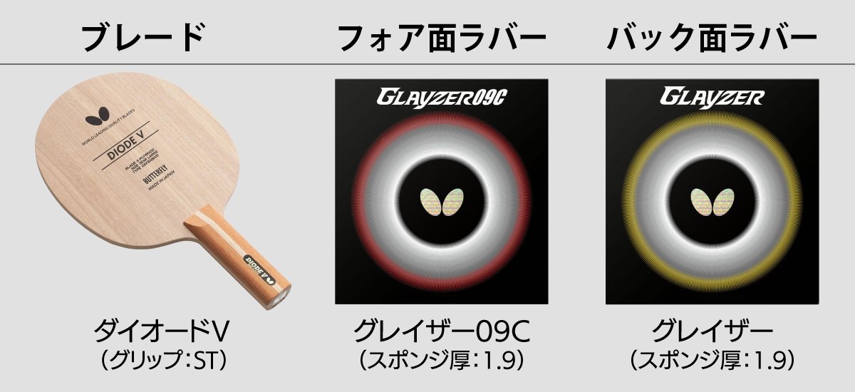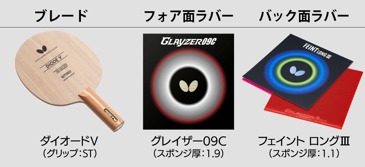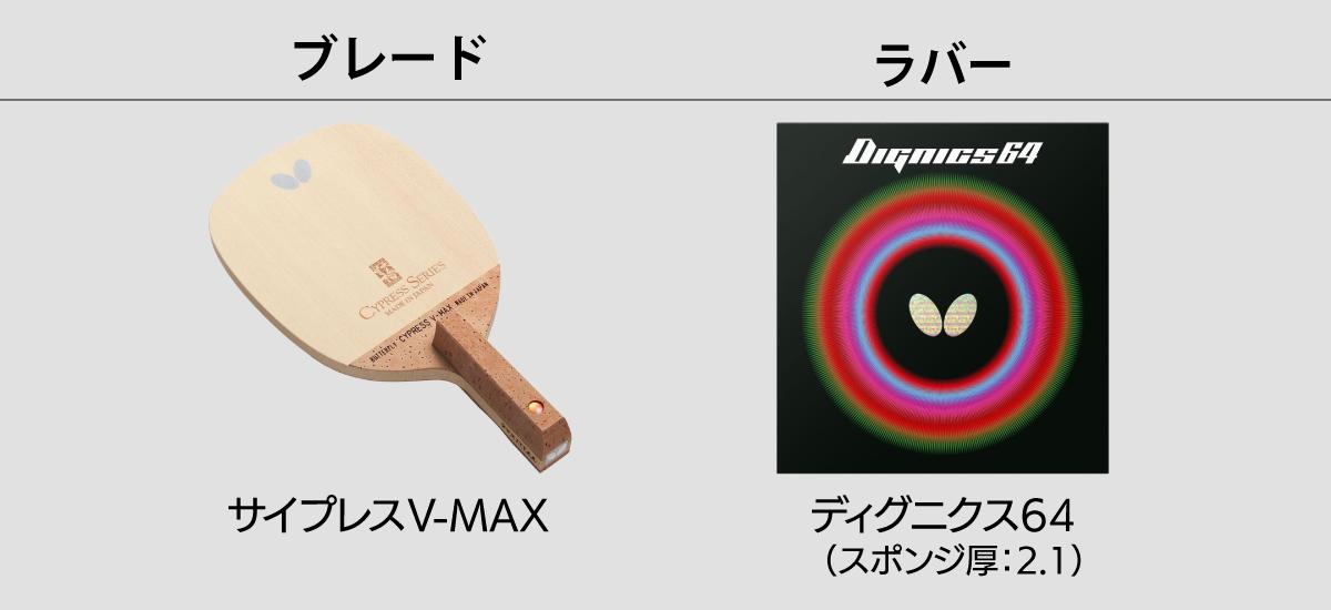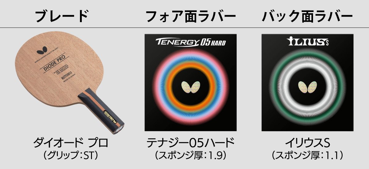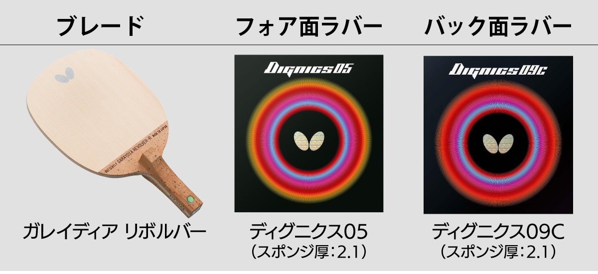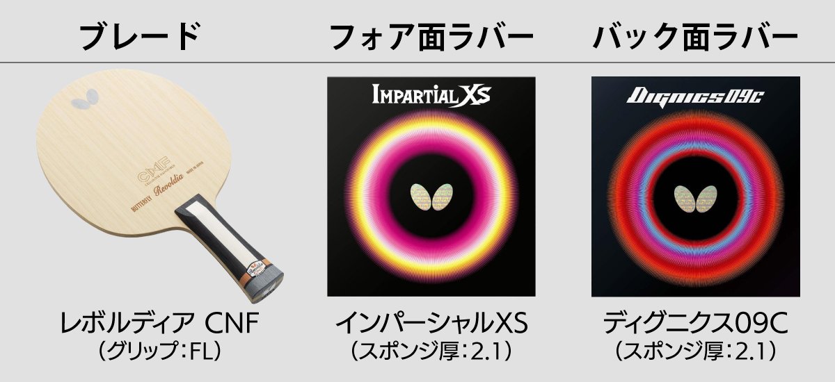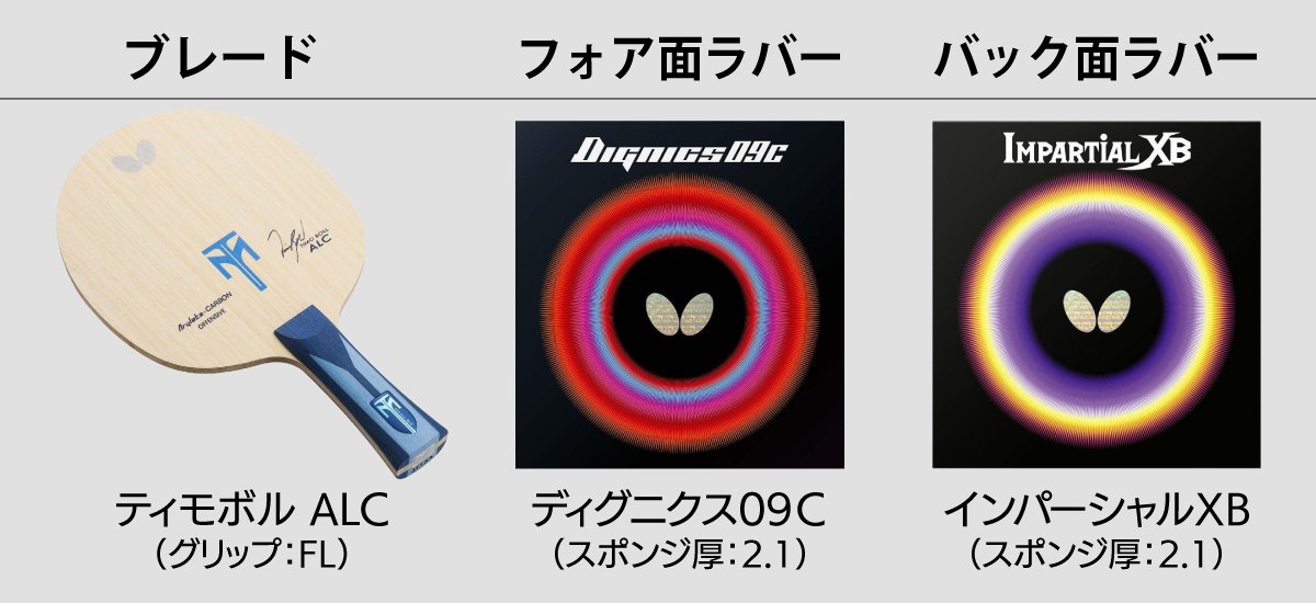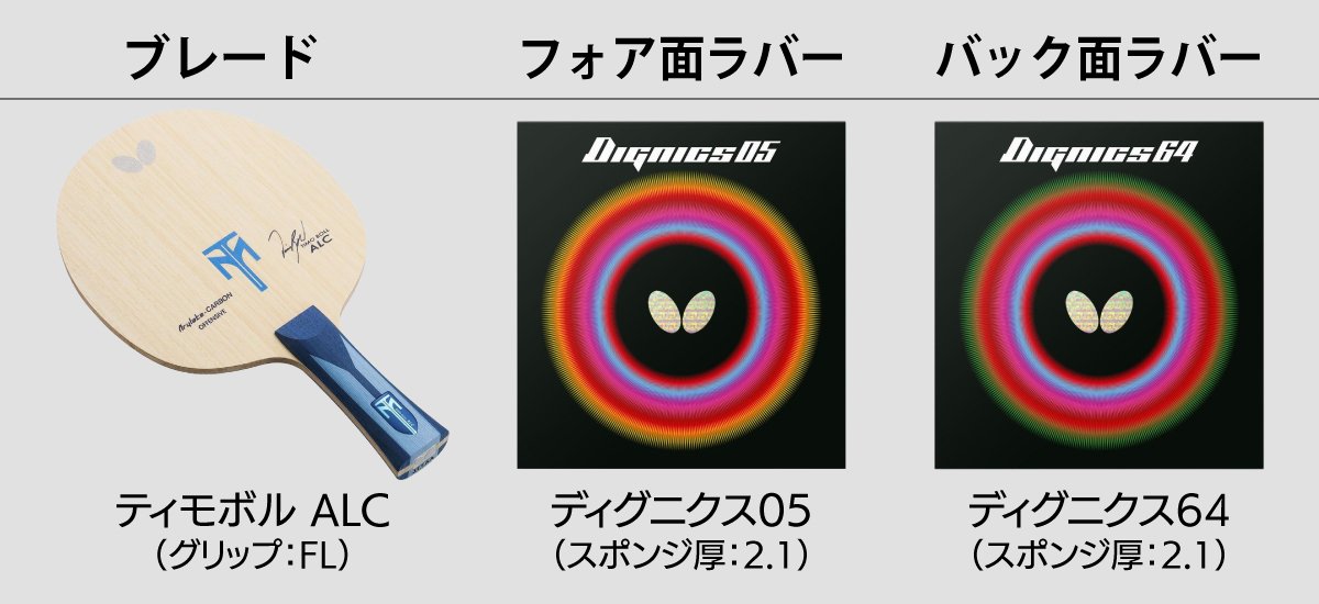 バック面表ラバーの異質型の方にオススメするのはある程度弾みがあって、ナックルも出しやすいティモボル ALCです。フォア面には回転量の多いディグニクス09C、バック面にはバランスのよいインパーシャルXBで連続攻撃ができる用具です。