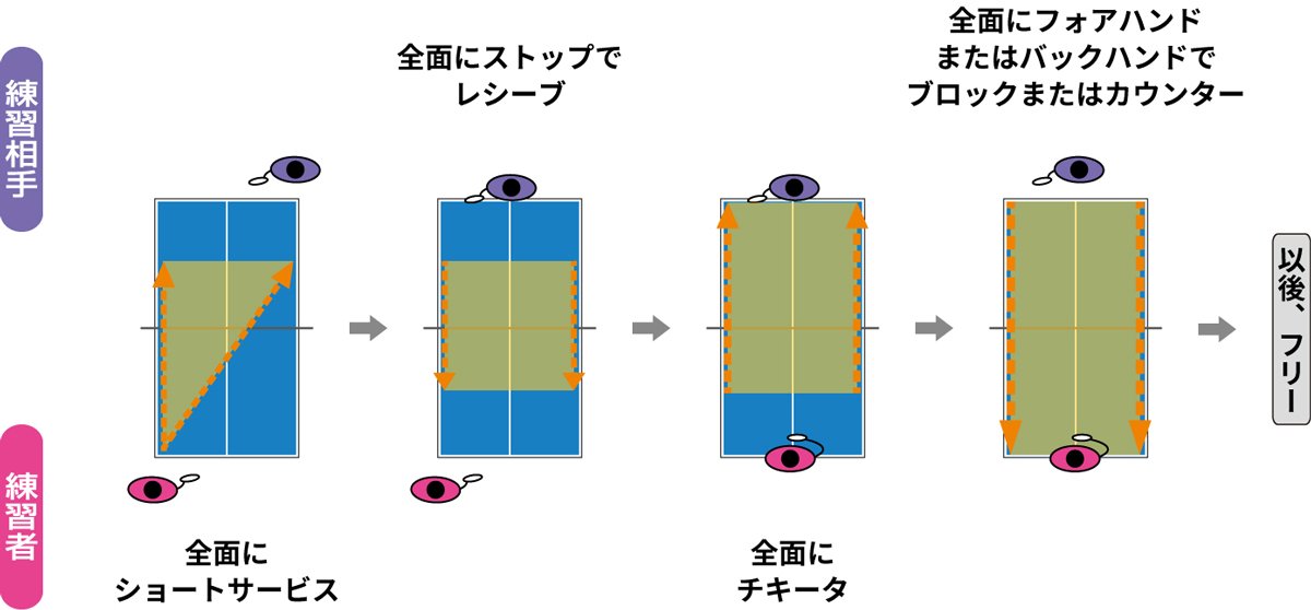 練習者Aが全面にショートサービスを出し、練習者Bが全面にストップでレシーブ。練習者Aが3球目でストップレシーブをチキータし、練習者Bがチキータを全面にフォアハンドまたはバックハンドでブロックまたはカウンターしてフリー。