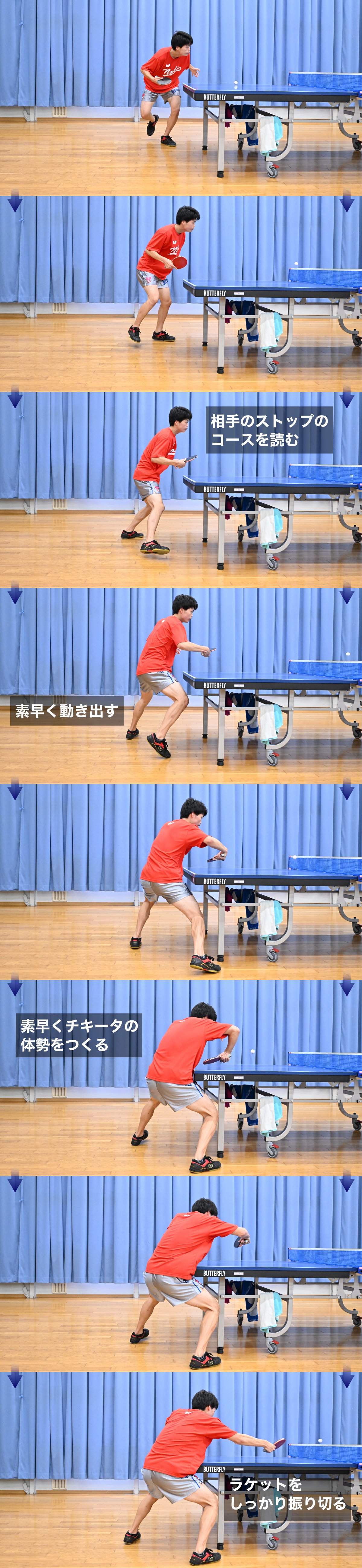 チキータの質を高めるポイントは、前回も述べましたが、「相手のコースを読んでチキータする」ことです。ボールが来てからチキータをしにいくのでは質の高いチキータはできません。相手の動きやラケット角度などから、「このコースにストップが来る」と読み切った上で、いち早くボールに近づき、チキータの体勢をつくることが大切です。