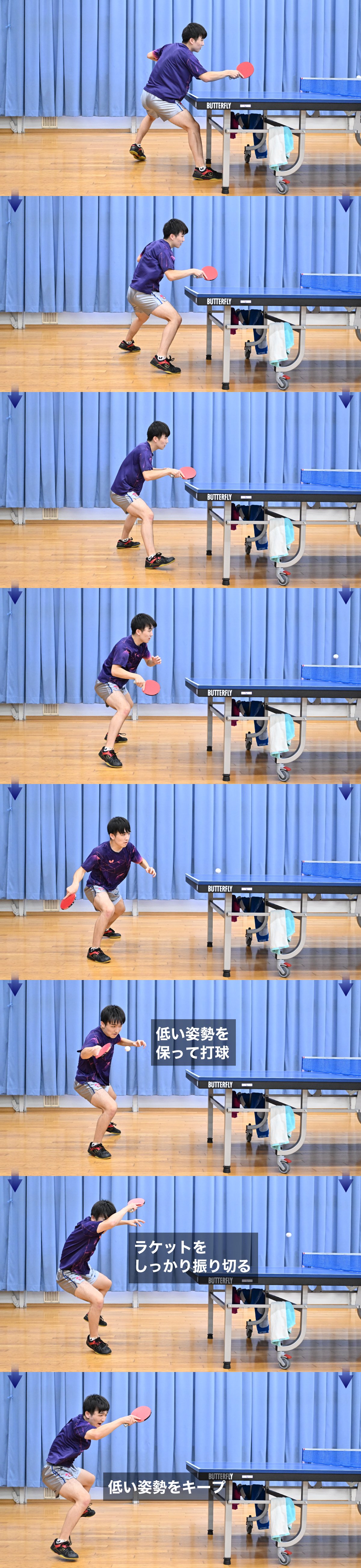 一方、チキータに対応するポイントは、「低い姿勢を保つ」ことです。チキータに押されて体が浮いてしまうと(上体が起き上がってしまうと)思うように対応できません。低い姿勢を保つことで、チキータをしっかり打ち返すことができます。