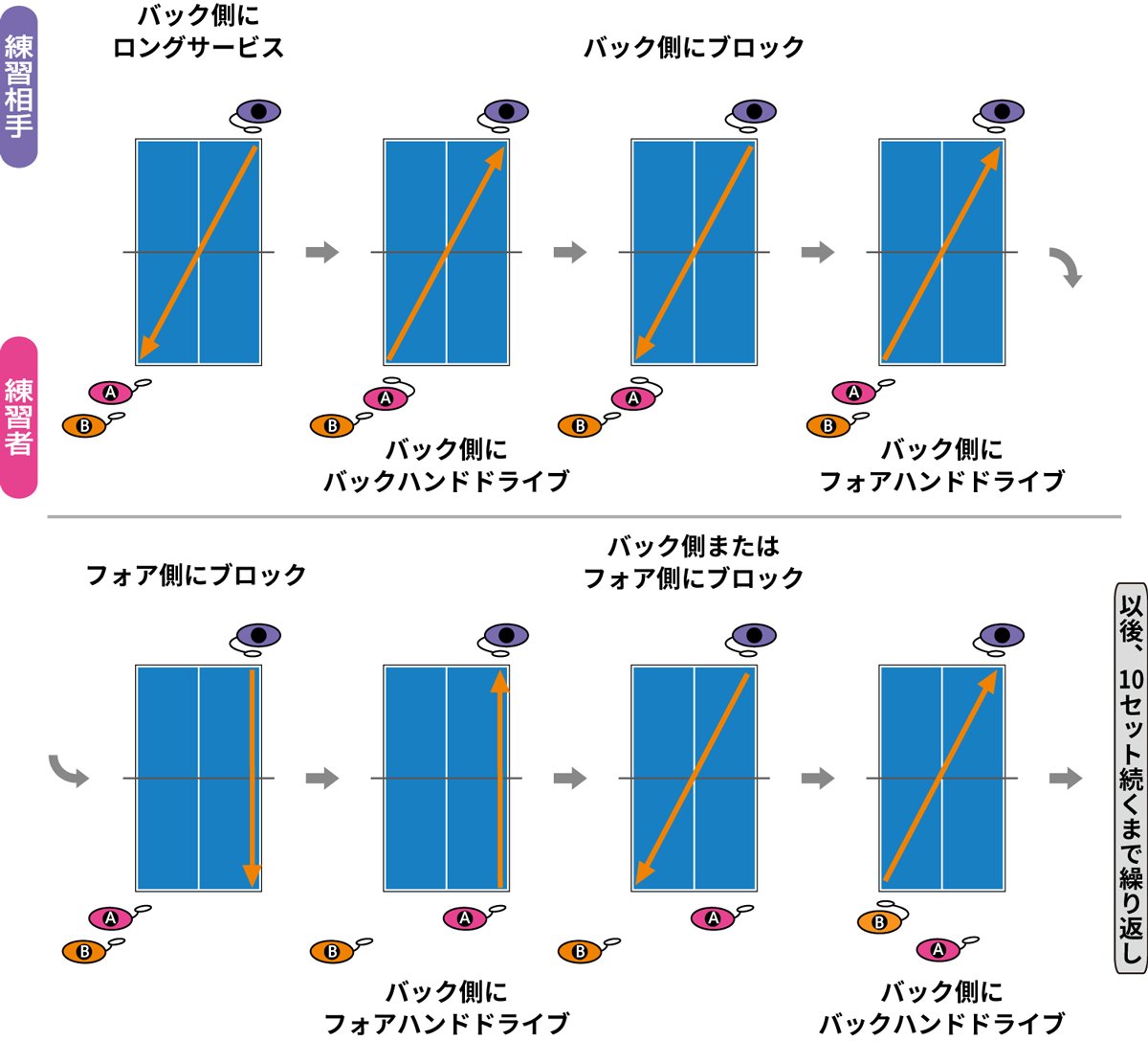 バック側2本→フォア側1本の順に送られるボールに対して、バックハンドドライブ→フォアハンドドライブ→フォアハンドドライブの順に打球するパターンを1セットとし、練習者Aと練習者Bが1セットごとに交代しながら、10セット続くまで練習を行う。10セット続いたら、練習者A、練習者B、練習相手の役割を適宜入れ替えて同様に練習を行う。