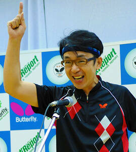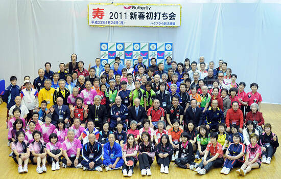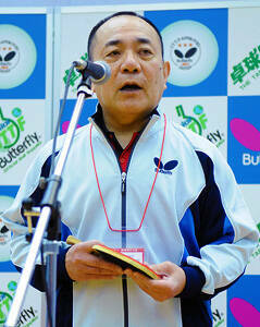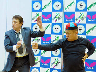 開会に先立って、らくご卓球クラブ・ヘッドコーチの三遊亭小遊三師匠が開会のあいさつを行った。続いてバタフライ卓球道場を運営する株式会社タマス代表取締役社長の山田俊策が歓迎のあいさつ。そして今回が初参加となるフリーアナウンサーの福澤朗さんがあいさつして「ジャストミート」の掛け声で会を盛り上げた。