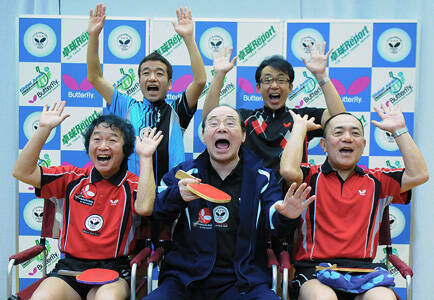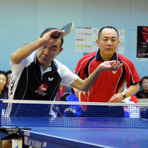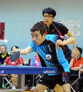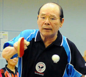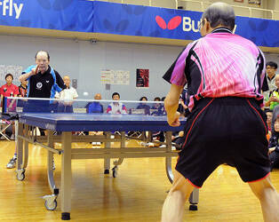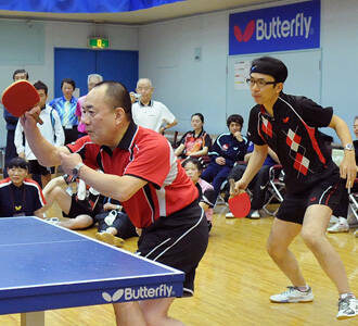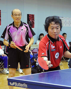 エキシビションに先立って林家こん平師匠が登場。伊藤繁雄元世界チャンピオンとラリーを続けて元気な姿を披露した。