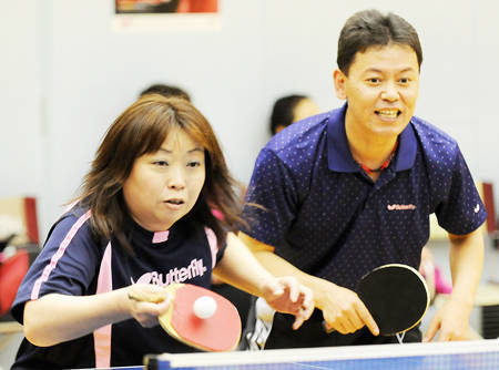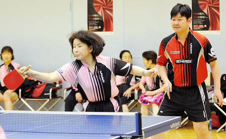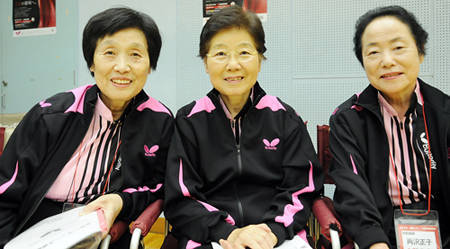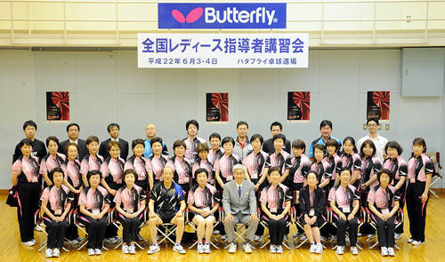講師は左から江口冨士枝さん(元世界チャンピオン)、松崎キミ代さん(元世界チャンピオン)、両澤正子さん(元世界ダブルスチャンピオン)という、世界を極めた豪華な顔ぶれ