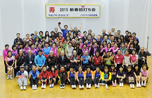 1月26日、東京都杉並区のバタフライ卓球道場で「2015新春初打ち会」が開催された。らくご卓球クラブ、月曜クラブのメンバーのほか、各地のレディースや俳優、音楽家など幅広い層の卓球愛好家が約150名参加し、チーム対抗のダブルス親善卓球大会やアトラクションで楽しいひとときを過ごした。