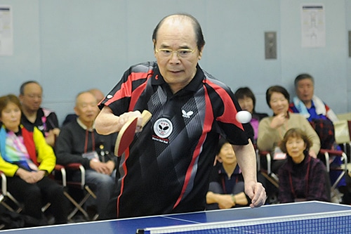 エキシビションマッチの後には昨年、初打ち会に参加することができなかった林家こん平師匠が登場。元世界チャンピオンの伊藤繁雄と元気にラリーする姿を見せた。
