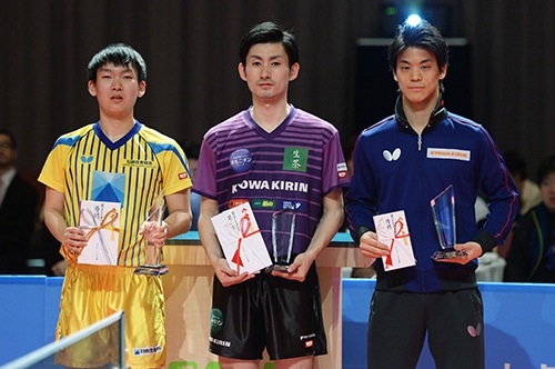 男子シングルス優勝の藤村と男子ダブルス優勝の上田/吉田