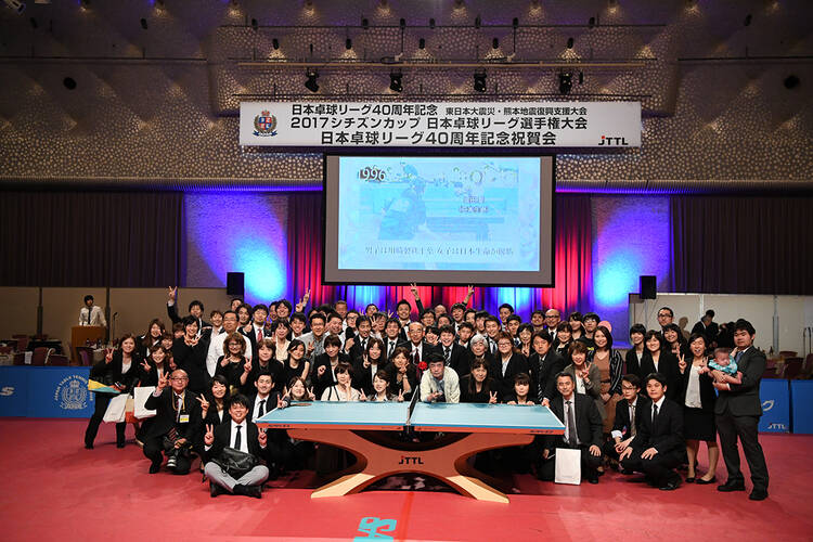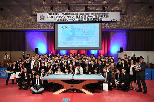 平成29年4月23日、日本卓球リーグ選手権大会終了後、グランドプリンスホテル新高輪・飛天の間で日本リーグ40周年を記念した祝賀会が執り行われた。河合弘行日本リーグ実業団連盟会長が主催者を代表してあいさつ、藤重貞慶(公財)日本卓球協会会長、朴主奉韓国実業団卓球連盟会長が来賓の祝辞を述べた。
