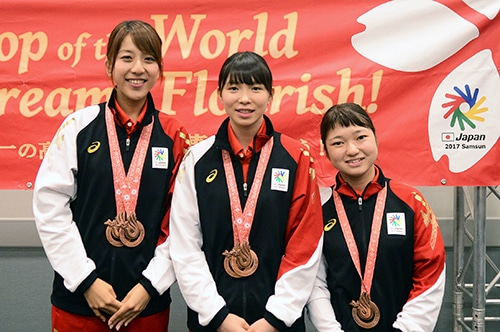 トルコのサムスンで開催された夏季デフリンピックの帰国報告会が参議院議員会館で行われた。日本からは11競技に106選手が参加し、過去最多の27個のメダル(金6、銀9、銅12)を獲得した。卓球競技では、亀澤理穂(花王)、川﨑瑞恵(大正大学)、高岡里吏(アクサ生命)の3選手が出場。見事女子団体で銅メダル、亀澤/川﨑ペアが女子ダブルス銅メダルに輝いた。