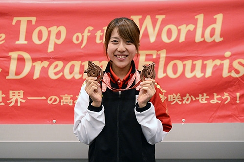 「今回で2日目の出場になります。前回の団体はベンチで応援でしたが、今回は初めて試合に出場しました。ベンチでの応援も緊張しましたが、試合に出る方がもっと緊張しました。でもみんなの応援を力に頑張りました。精一杯自分の力を出し切れたから良かったと思います。団体もダブルスも銅メダルでした。目標は金メダル、そして中国やウクライナの強い選手に勝つことでした。結果は3位でしたがみんなで頑張って獲得したメダルなので良かったです。