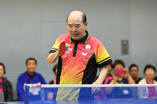 開会に先立って、らくご卓球クラブ・ヘッドコーチの三遊亭小遊三師匠があいさつを行った。恒例のチーム対抗ダブルス親善試合では8チームに分かれて参加者が勝利を目指して戦った。