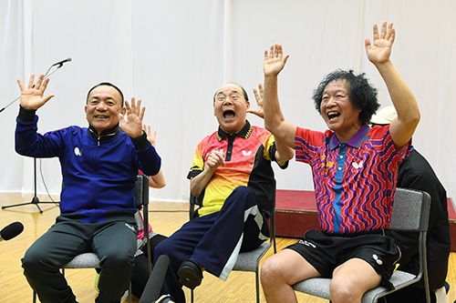 小遊三師匠(右)/木村さんも好プレーを見せたエキシビションマッチの後には、らくご卓球クラブの監督である林家こん平師匠が登場し、伊藤繁雄さんとラリーを行った。その後の記者会見ではこん平師匠、小遊三師匠、山田隆夫さんによる「ちゃらーん」が披露され、拍手が巻き起こった。