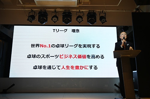 同会見では藤重貞慶理事長がリーグの理念として「世界No.1の卓球リーグを実現する」「卓球のスポーツビジネス価値を高める」「卓球を通じて人生を豊かにする」という3つを挙げた。このほか、世界のトップ選手をはじめ、誰もが参加できる地域密着型のリーグシステムをつくること、トップ選手が戦うTプレミアをはじめ、T1、T2、T3といったように階層的な競技システムをつくることをコンセプトとして掲げた。