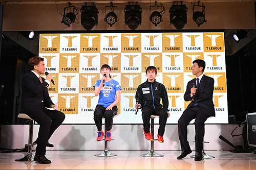 松下専務理事による参加チームの発表 その後はゲスト選手の早田ひな(日本生命)、丹羽孝希(スヴェンソン)、松下専務理事によるミニトークショーが行われた。早田は「ロゴマークを見て、卓球のラケットが思い浮かぶイメージだったので、このロゴを見たときに卓球のTリーグだと思ってもらえるように盛り上げていきたいです。会場に見に来ていただきたいというのが私の一番の思いです」とTリーグへの思いを話した。丹羽は「Tリーグができるのは楽しみにしていましたし、国内で世界のトップ選手と戦う機会は今まであまりなかったので楽しみです。卓球は近くで見ると、ボールのスピードも速く、迫力があるので初めて見る人は衝撃を受けると思います。ぜひ会場に足を運んでほしいです」と、語った。