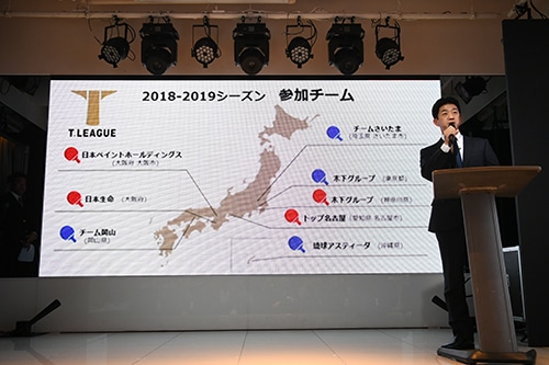 2月7日、渋谷DAIA(東京)で一般社団法人Tリーグが記者会見を開き、リーグの理念やロゴマーク、2018-2019シーズンの参加チームを発表した。