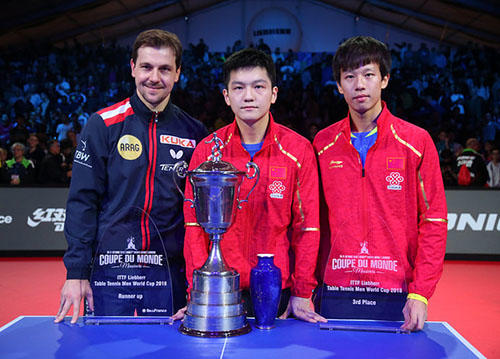 優勝の樊振東(中央)、2位のボル(左)、3位の林高遠(右)