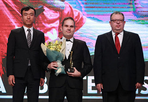 ホーディ・モラレス(中央) 男子パラスター賞を受賞したホーディ・モラレス(スペイン)はクラス7(立位)の選手。今年開催されたパラ卓球の世界選手権大会で金メダルを獲得した。