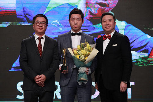 許昕(中央) スターポイント賞を受賞した許昕(中国)は、意外にも初のスターアワード受賞となった。世界卓球2018ハルムスタッドの男子団体準々決勝、2番のフェゲアル(オーストリア)戦、第3ゲームのポイント4対2の場面で見せたファンタスティックなプレーによって受賞した。